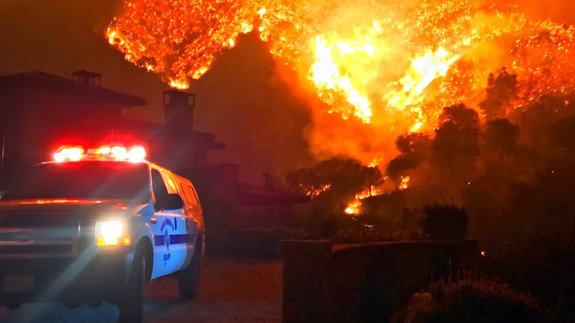 In Santa Barbara County, fire burns canyons and ridges above Bella Vista Drive near Romero Canyon, as the fight to contain a wildfire continues in Montecito, Calif.