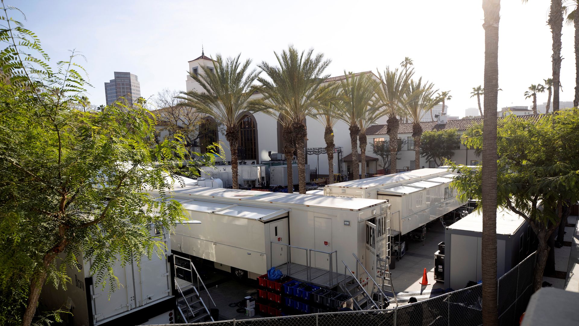Production trucks at Union Station in L.A. Photo: Mario Anzuoni/Reuters