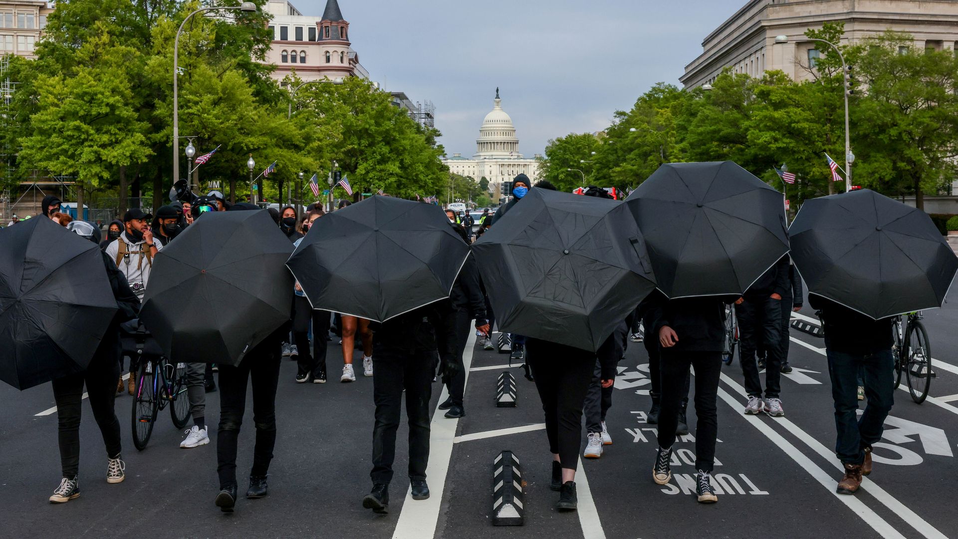 - Calling for racial justice and police reforms, demonstrators marched in Washington yesterday with black umbrellas to conceal their faces.