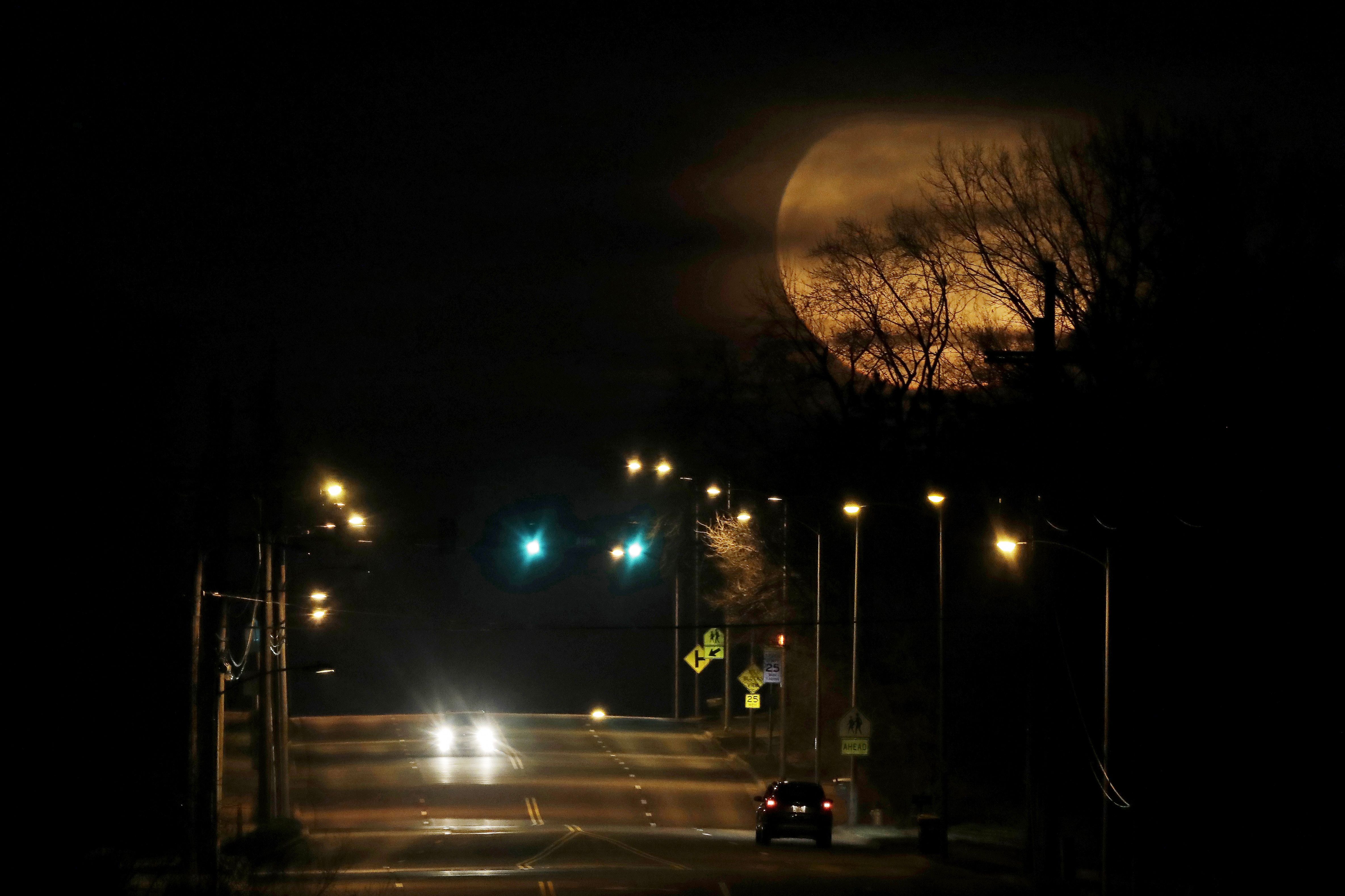 In this photo, cars are dwarfed as a nearly full moon rises over Shawnee, Kan., on March 10.