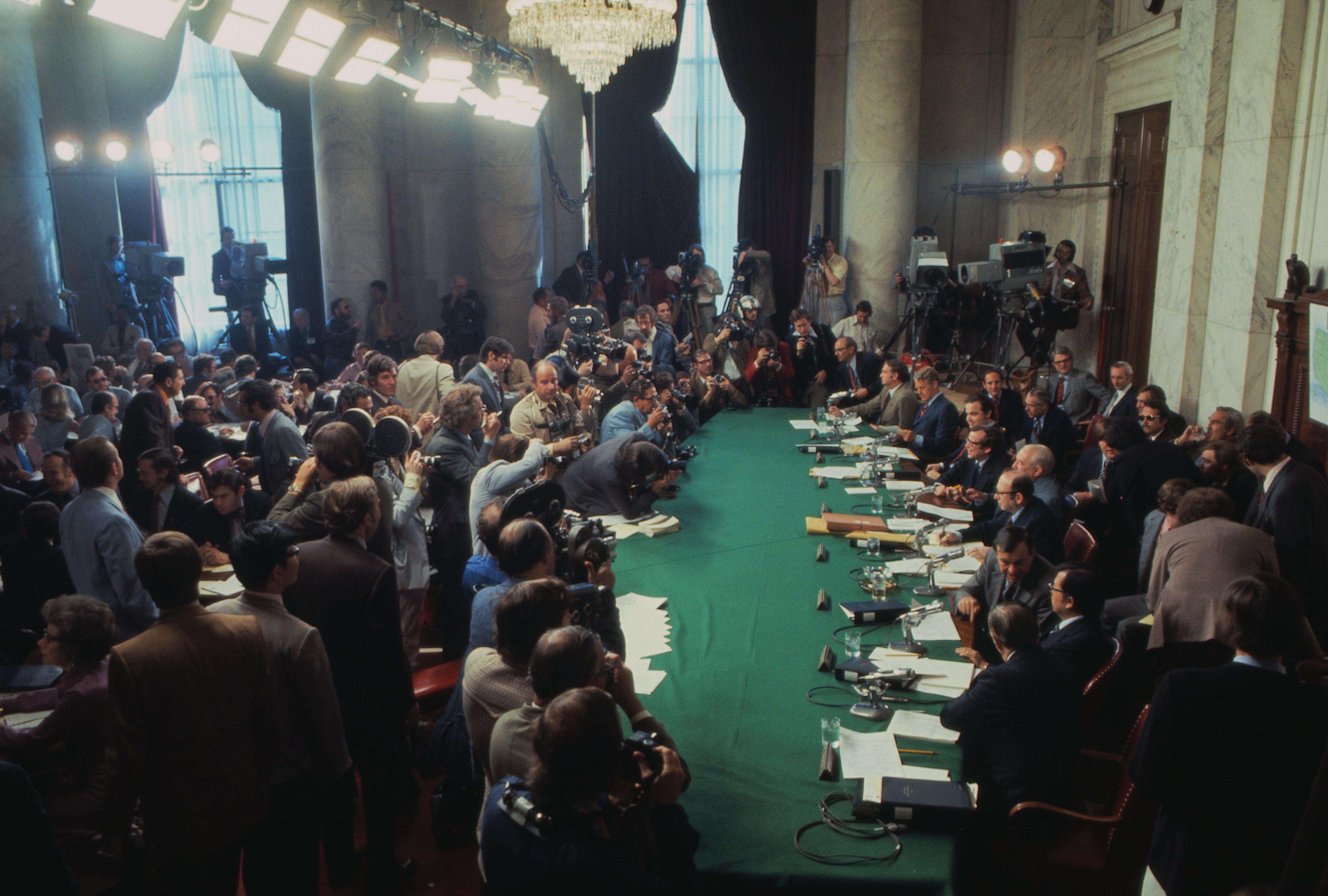 - Original caption for this photo ... Washington: General view in the packed Senate Caucus room as the Select Senate Committee on Presidential Campaign Activities opened its investigation into the Watergate scandal 5/17. Only 100 public seats were available — the remainder of the crowd were newsmen and members of Congress.