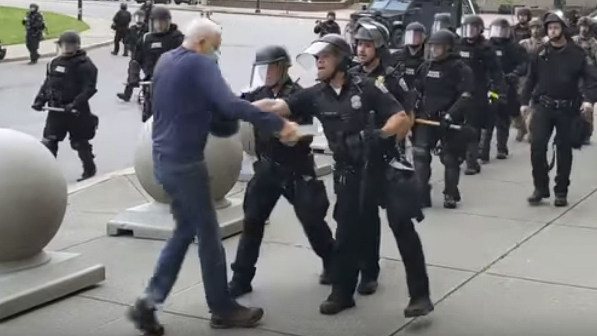 In this image from video provided by NPR station WBFO, a Buffalo police officer shoves a man who walked up to police yesterday. The man fell, hit his head on the pavement, and was bleeding as officers walked past to clear Niagara Square.