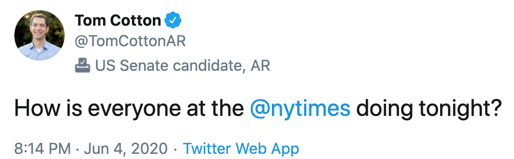 - Dozens of Times employees protested on social media. Many journalists tweeted this condemnation: "Running this puts Black @NYTimes staff in danger."