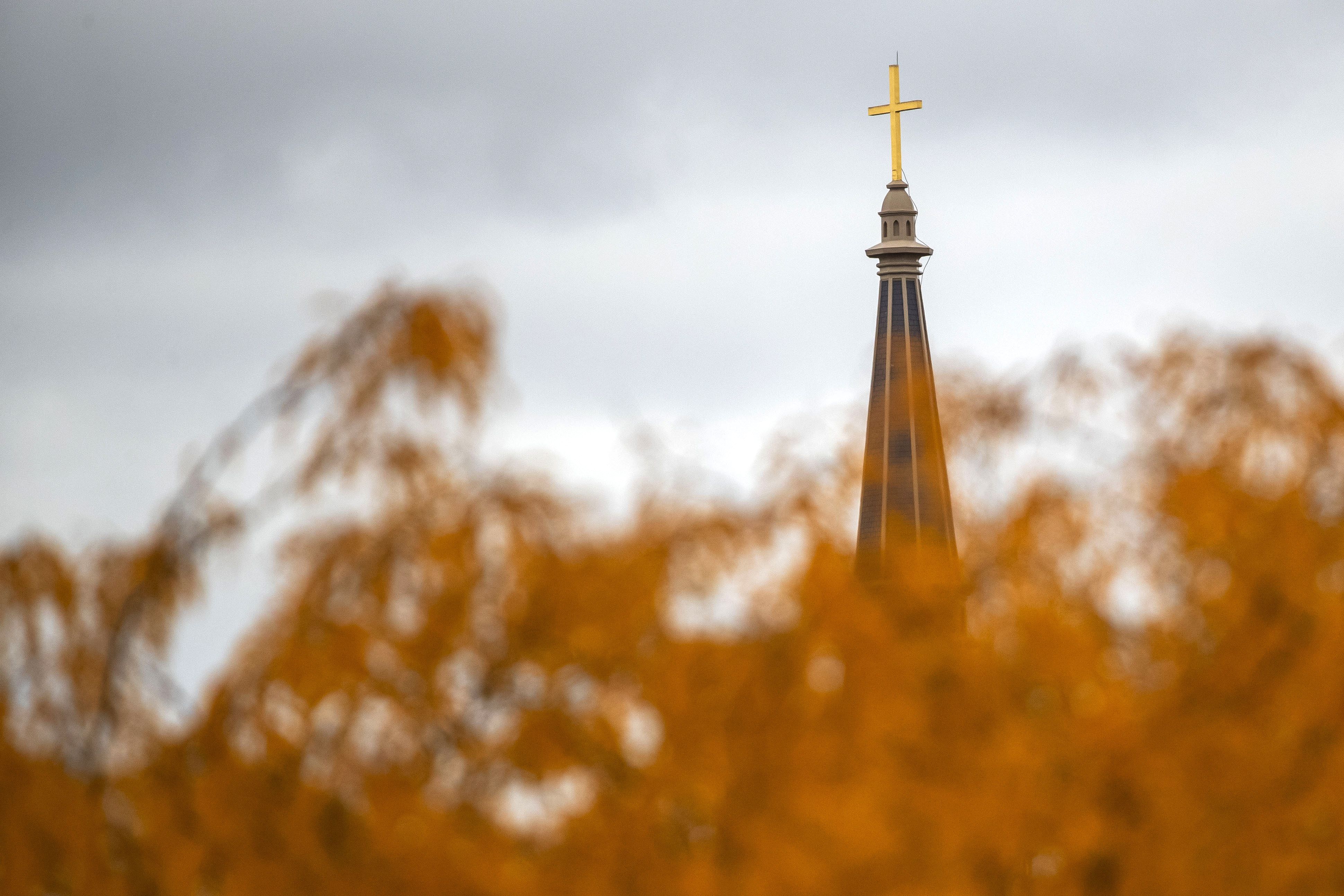 The steeple of the Basilica of the Sacred Heart is seen through fall foliage before the football game between Notre Dame and Pitt in South Bend, Ind., yesterday. The Fighting Irish won, 58-7.