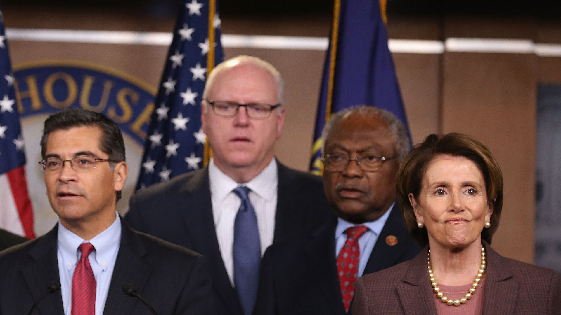Rep. Joe Crowley (D-N.Y.), center, with Rep. Xavier Becerra (D-Calif.), Rep. James Clyburn (D-S.C.) and House Democratic Leader Nancy Pelosi. (Mark Wilson / Getty Images)