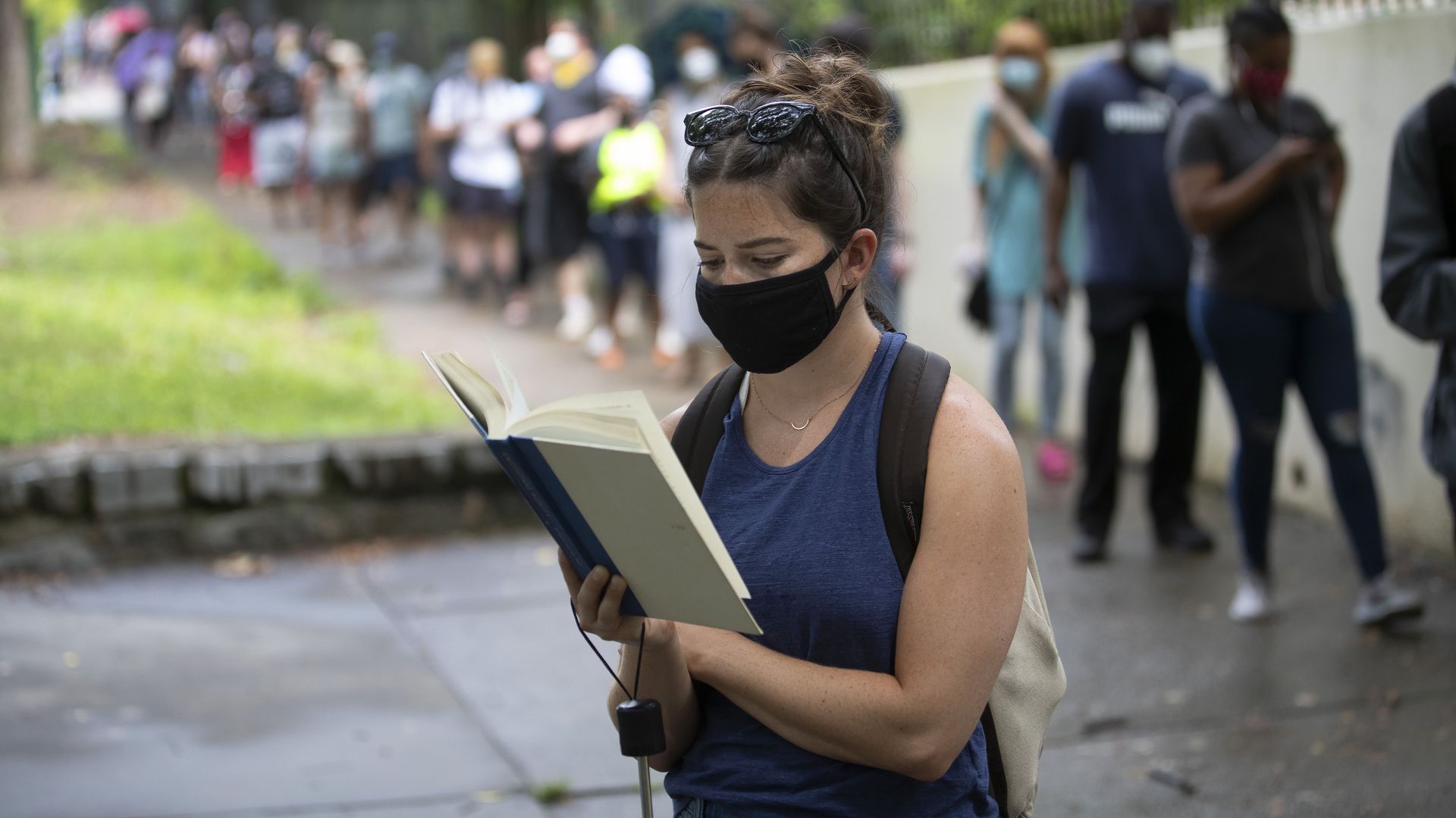 Kelsey Luker reads during her two-hour wait to vote in Atlanta yesterday. Photo: John Bazemore/AP