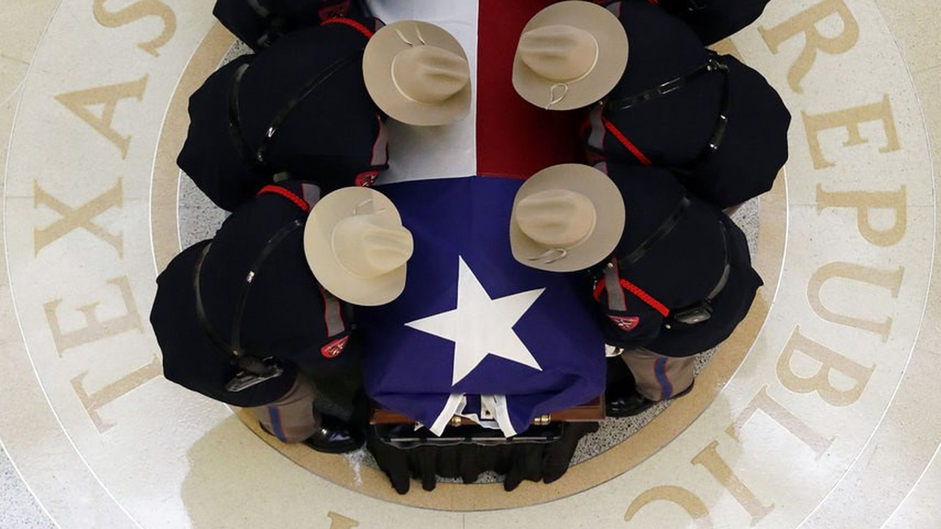 Honor guard moves the casket of former Texas Governor Mark White, who died Saturday at 77, to lie in state yesterday in the Rotunda of the Texas Capitol in Austin. Hundreds paid last respects.