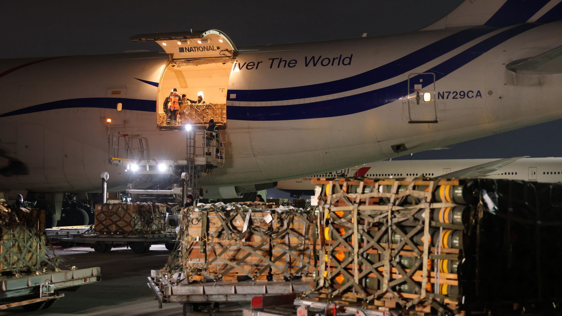 Ground personnel unload weapons, including Javelin anti-tank missiles, and other military hardware delivered by the U.S. military near Kyiv on Tuesday. Photo: Sean Gallup/Getty Images