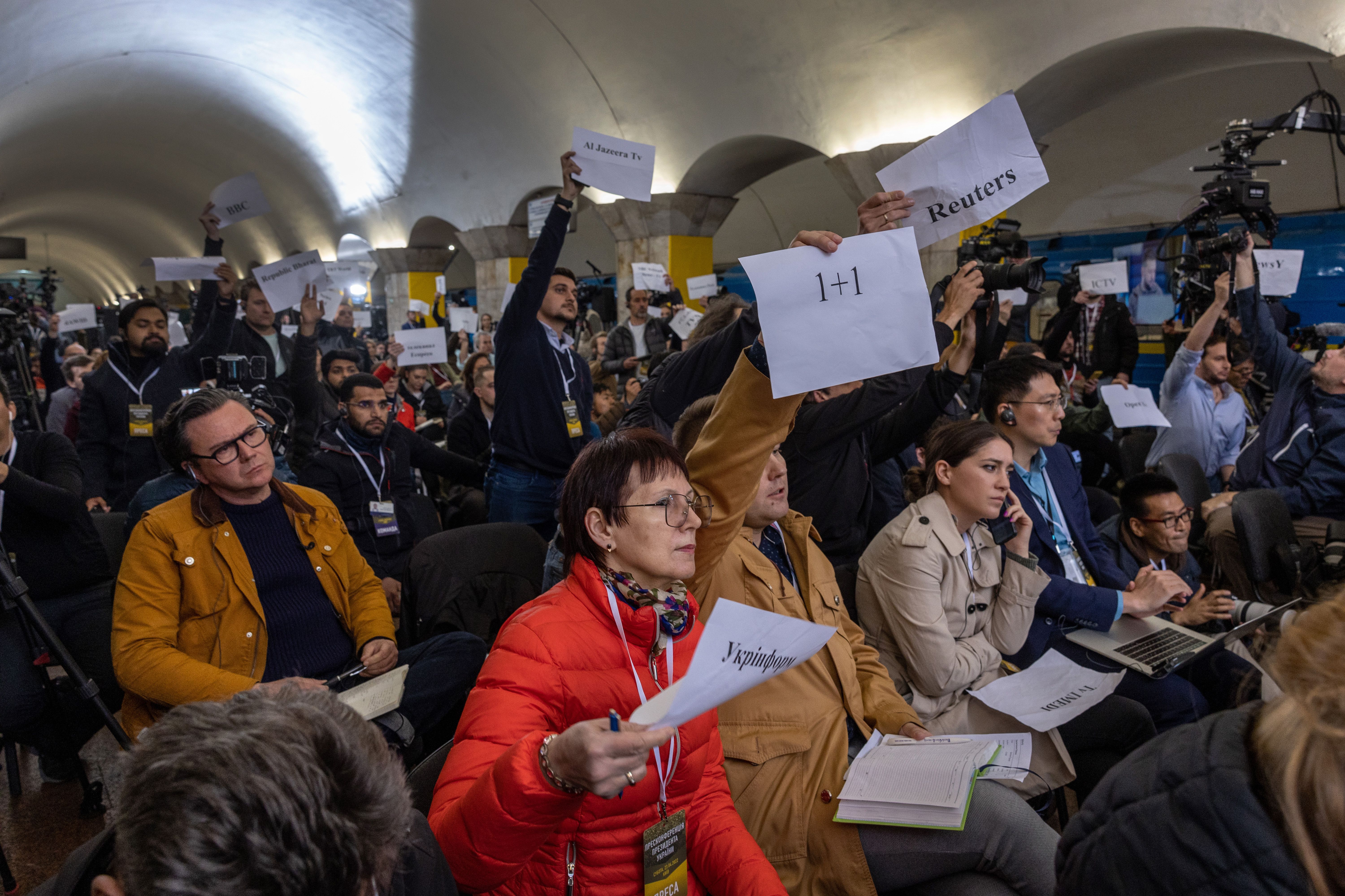 Ukrainian President Volodymyr Zelensky holds a press conference with international media in an underground metro station in Kyiv yesterday.