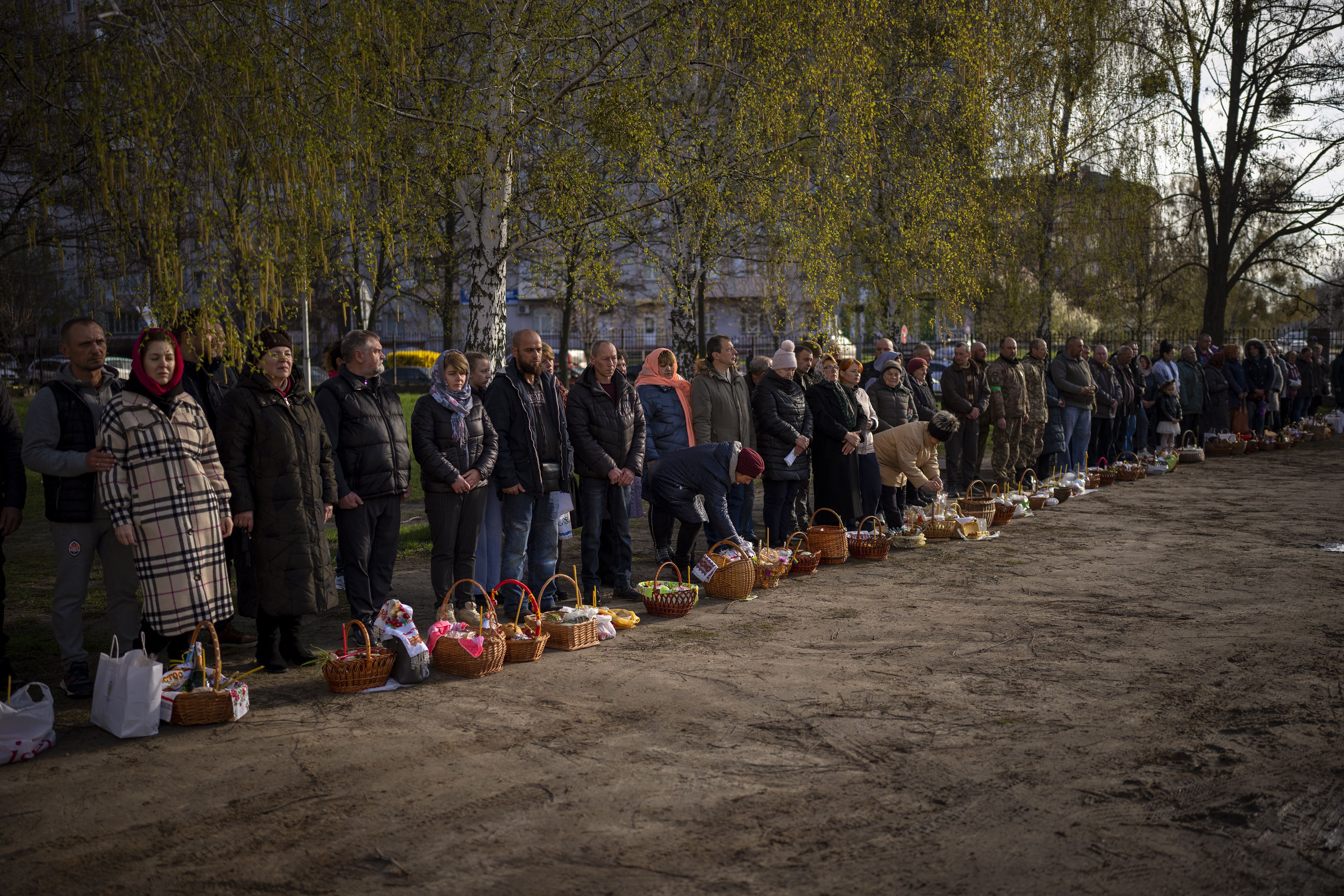 On Orthodox Easter, worshipers stand next to their traditional cakes and painted eggs during a service today at a church in Bucha, outside Kyiv.