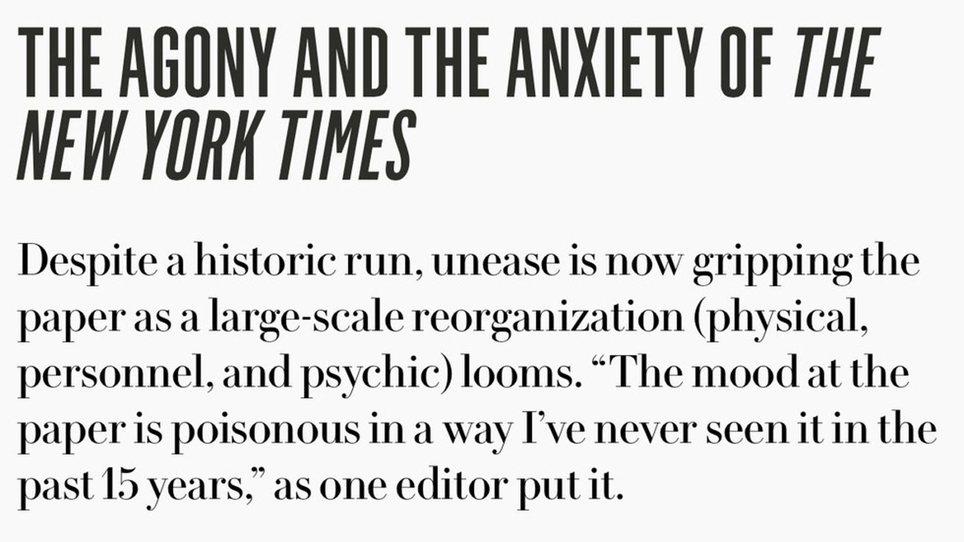 - And yet one editor tells Joe: "The mood at the paper is poisonous in a way I've never seen it in the past 15 years." It's because of a reduction in copy editors as the paper continue reorienting for digital: "A major newsroom reorganization is upending a time-honored method of producing the Times's signature journalism while simultaneously making an entire class of employees feel obsolete."