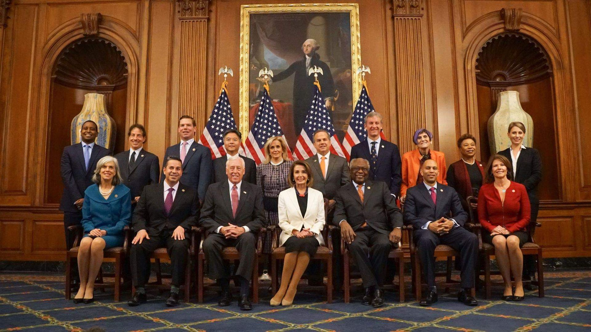 - Back row, left to right: Joe Neguse, Freshman Leadership Representative; Jamie Raskin, Caucus Leadership Representative; Eric Swalwell, Steering and Policy Committee Co-Chair; Ted Lieu, Democratic Policy and Communications Committee Co-Chair; Debbie Dingell, DPCC Co-Chair; David Cicilline, DPCC Chair; Matt Cartwright, DPCC Co-Chair; Rosa DeLauro, Steering and Policy Committee Co-Chair; Barbara Lee, Steering and Policy Committee Co-Chair; Katie Hill, Freshman Leadership Representative.