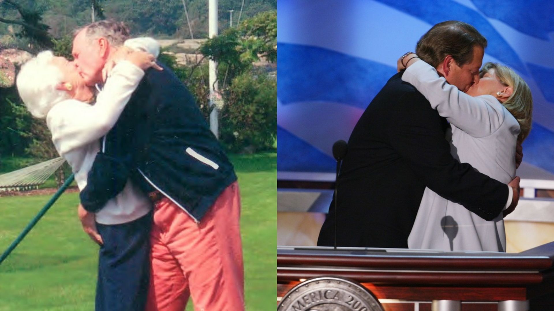 President Bush sent Maureen Dowd this parody of Al and Tipper Gore's kiss at the 2004 Democratic convention. (Left: Courtesy Maureen Dowd. Right: Mark Wilson/Getty Images)