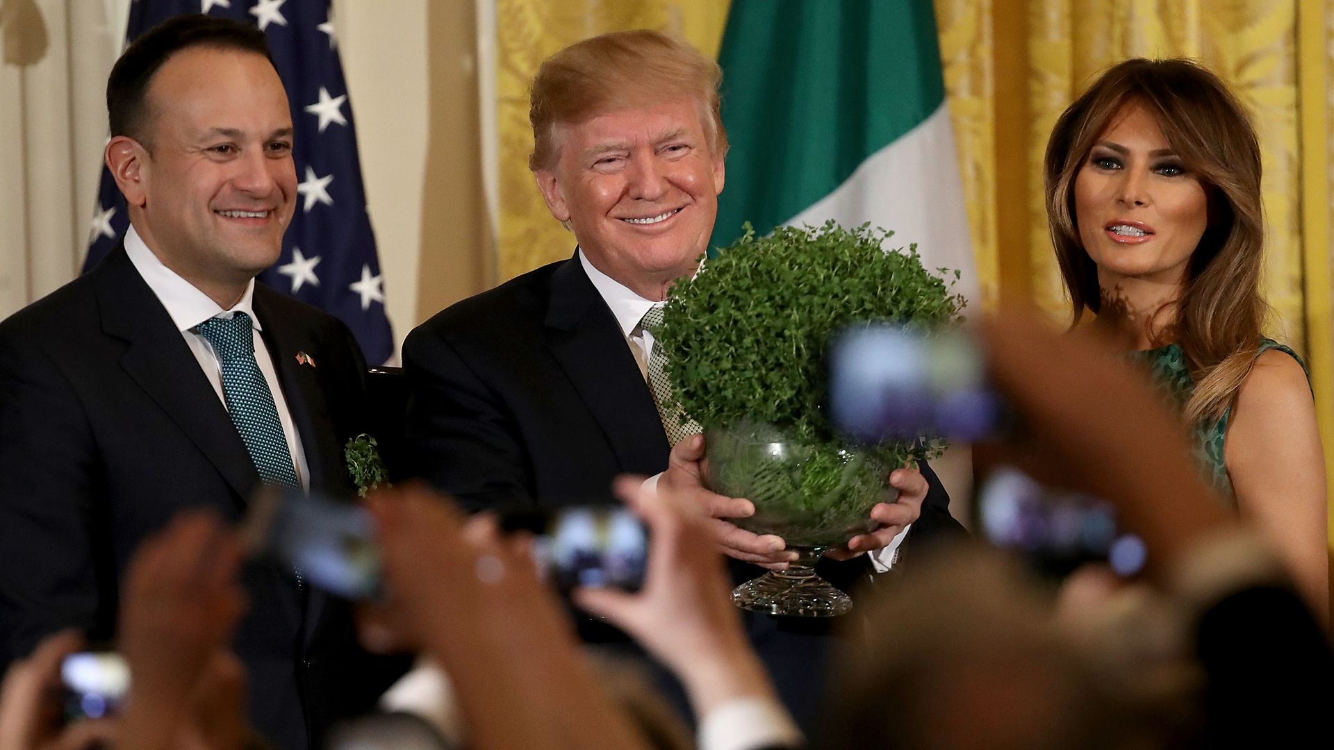 President Trump receives a shamrock bowl from Irish Prime Minister Leo Varadkar, with First Lady Melania Trump at the White House yesterday. (Win McNamee / Getty Images)
