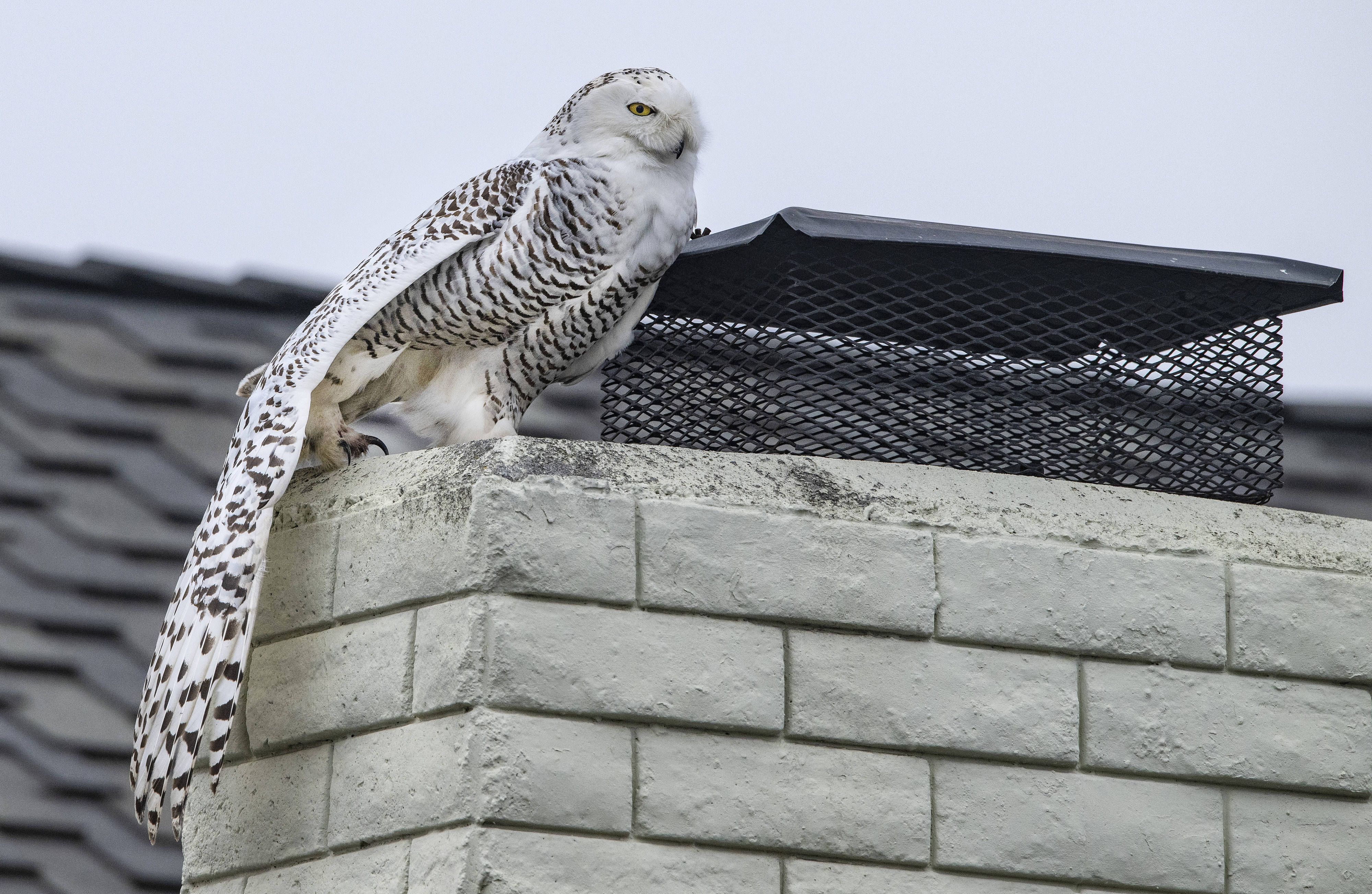 A snowy owl — normally found around the Arctic, Canada and northern states — stretched and preened this week atop a chimney on a palm-lined residential street in Cypress, Calif., in Orange County.