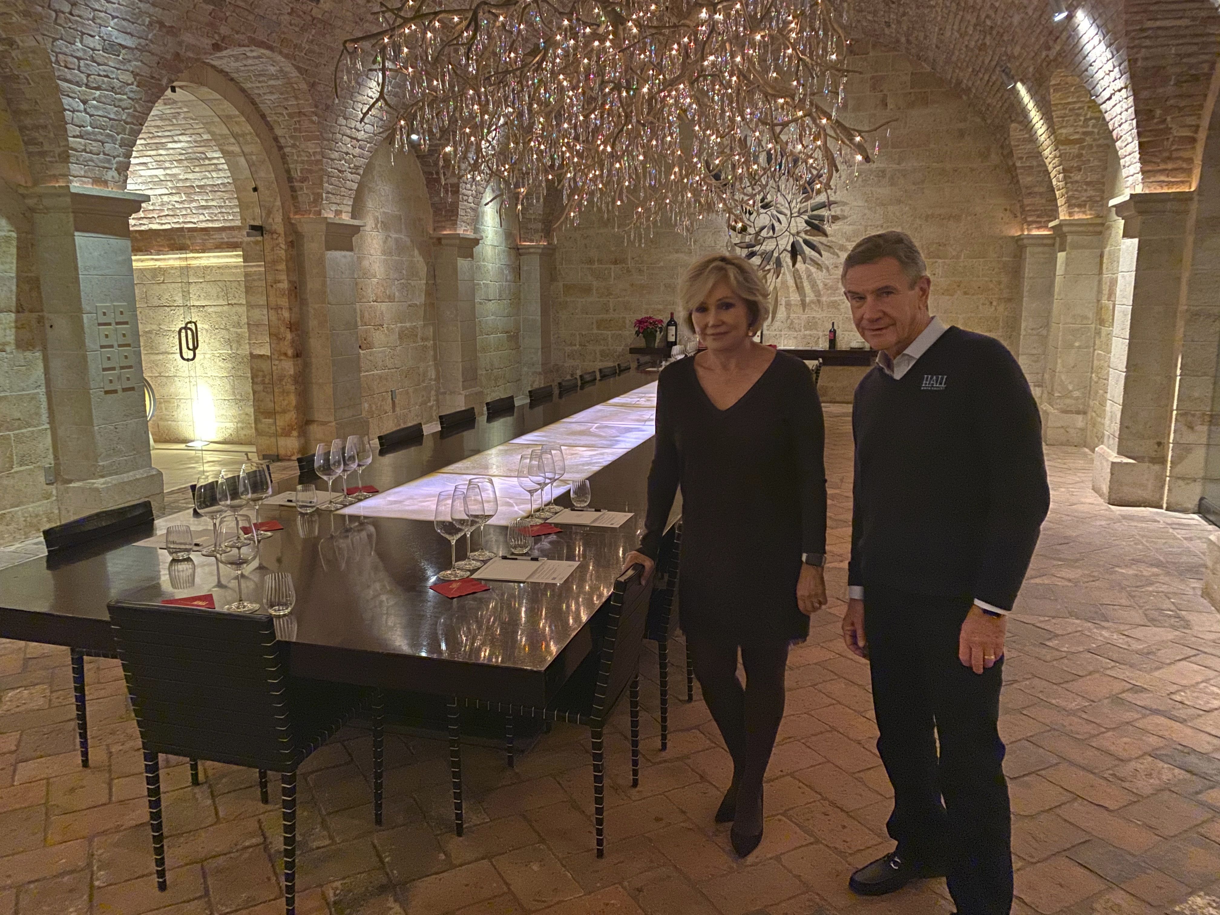 Kathryn and Craig Hall, owners of Hall Rutherford Winery in Napa Valley, stand inside the "wine cave" dining room where they held a fundraising dinner for Pete Buttigieg that was mocked by Elizabeth Warren in Thursday's debate.