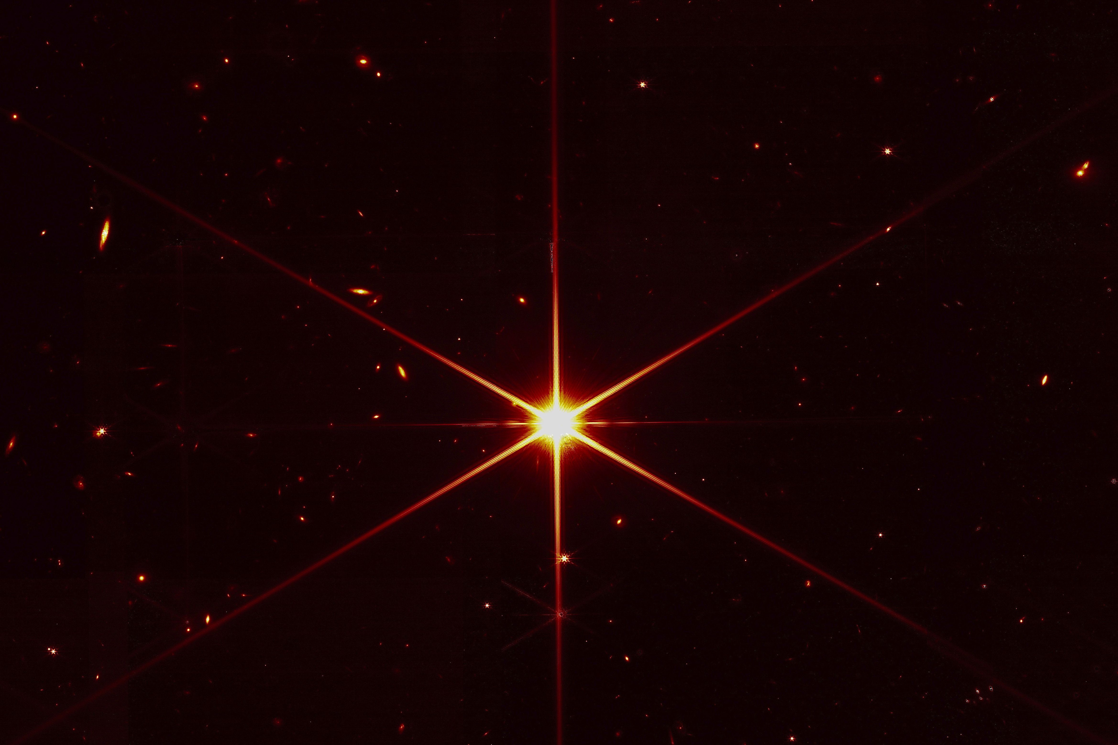 This image from NASA shows star 2MASS J17554042+6551277, which was used to align the 18 mirrors of the James Webb Space Telescope, with galaxies and stars photobombing behind it.