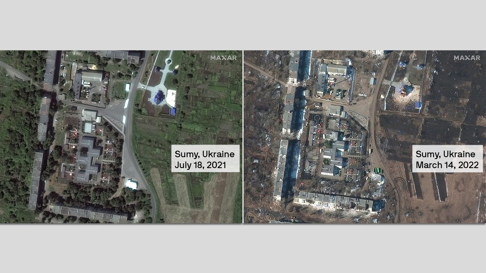 These two satellite photos show war damage to apartment buildings and a church in Sumy, in northeastern Ukraine.