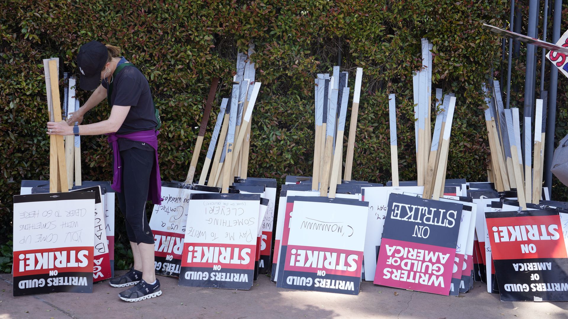 A demonstrator chooses from a pile of signs during a Writers Guild rally in front of The Walt Disney Company studio last week. Photo: Chris Pizzello/AP