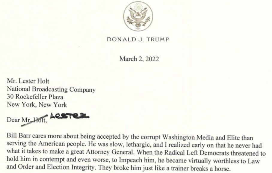 Former President Trump rants against Bill Barr, his former attorney general, in a three-page letter to "NBC Nightly News" anchor Lester Holt, who interviewed Barr about his new book, "One Damn Thing After Another," out tomorrow.