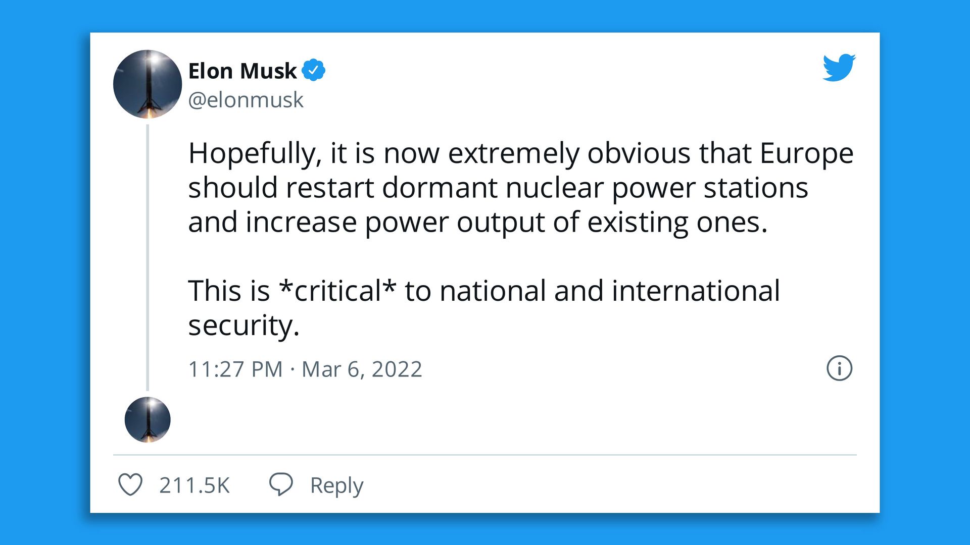 - His tweet yesterday (above) in support of nuclear power came two days after Musk, whose company is the market leader in electric vehicles, tweeted that "we need to increase oil & gas output immediately ... extraordinary times demand extraordinary measures."