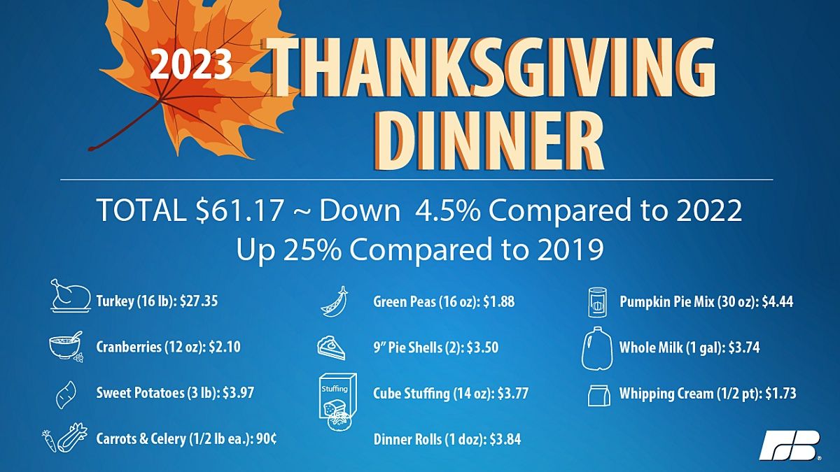 - The survey found the average cost of this year's holiday meal for 10 people was $61.17, down from $64.05 in 2022 โ but still 25% higher than in 2019, before the pandemic.