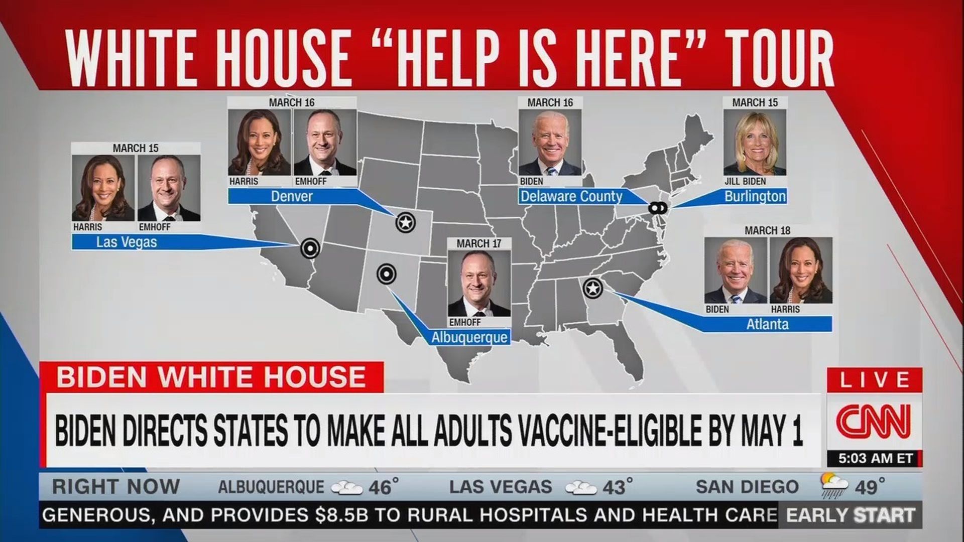 - Biden promised: "[W]e’ll have enough vaccine supply for all adults in America by the end of May. That's months ahead of schedule."