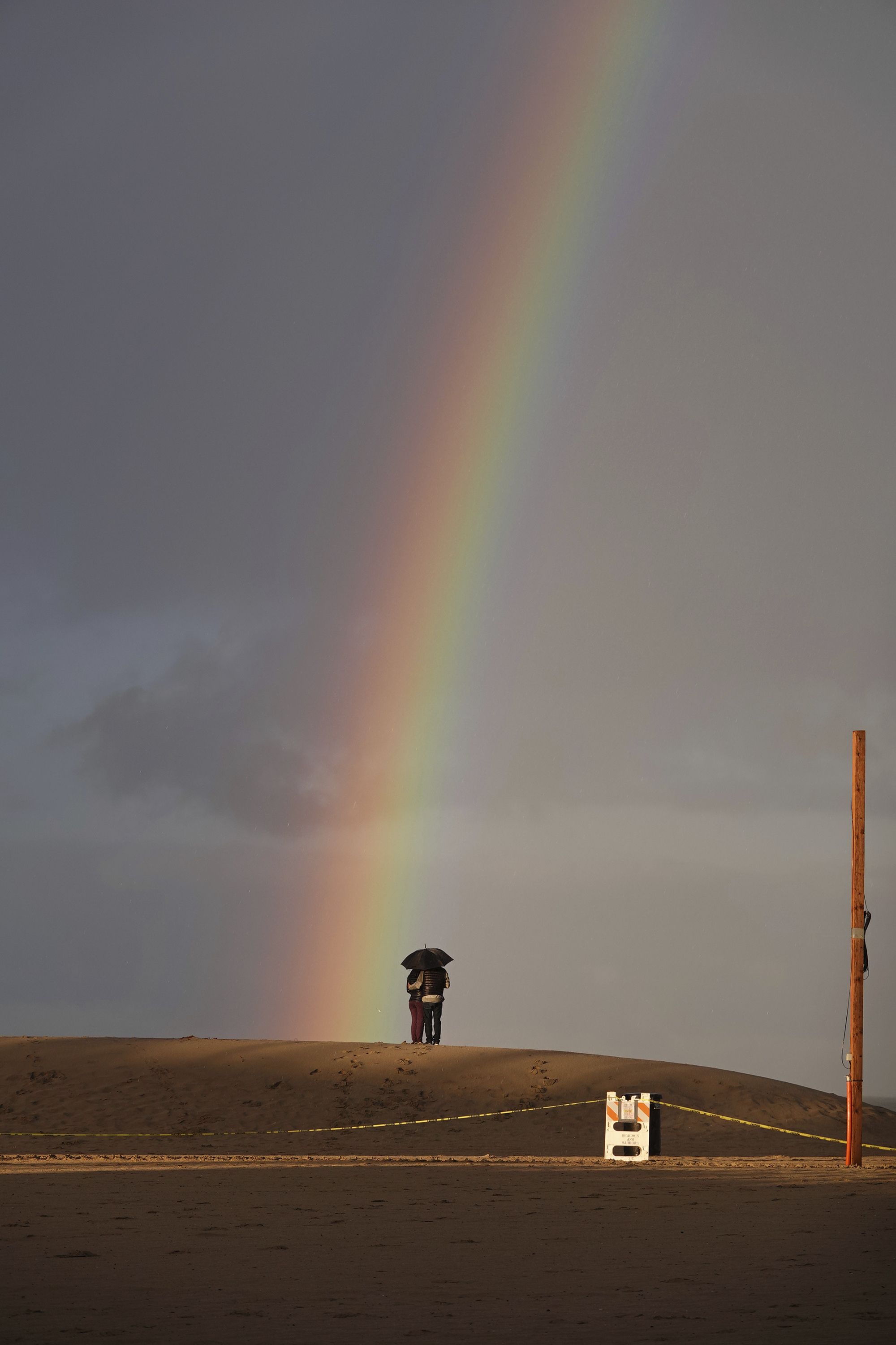 This rainbow appeared off the virtually empty beach in Santa Monica, Calif.