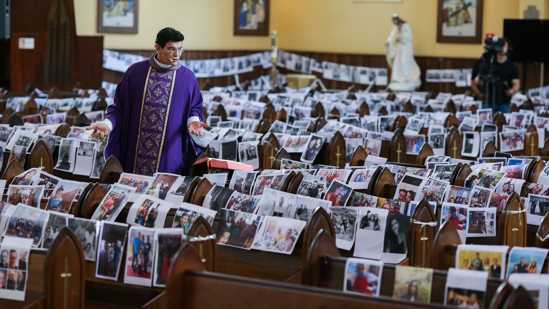 Above: In Curitiba, Brazil, Catholic priest Reginaldo Manzotti conducts a Mass, broadcast live on television, with photos of the faithful attached to the pews.