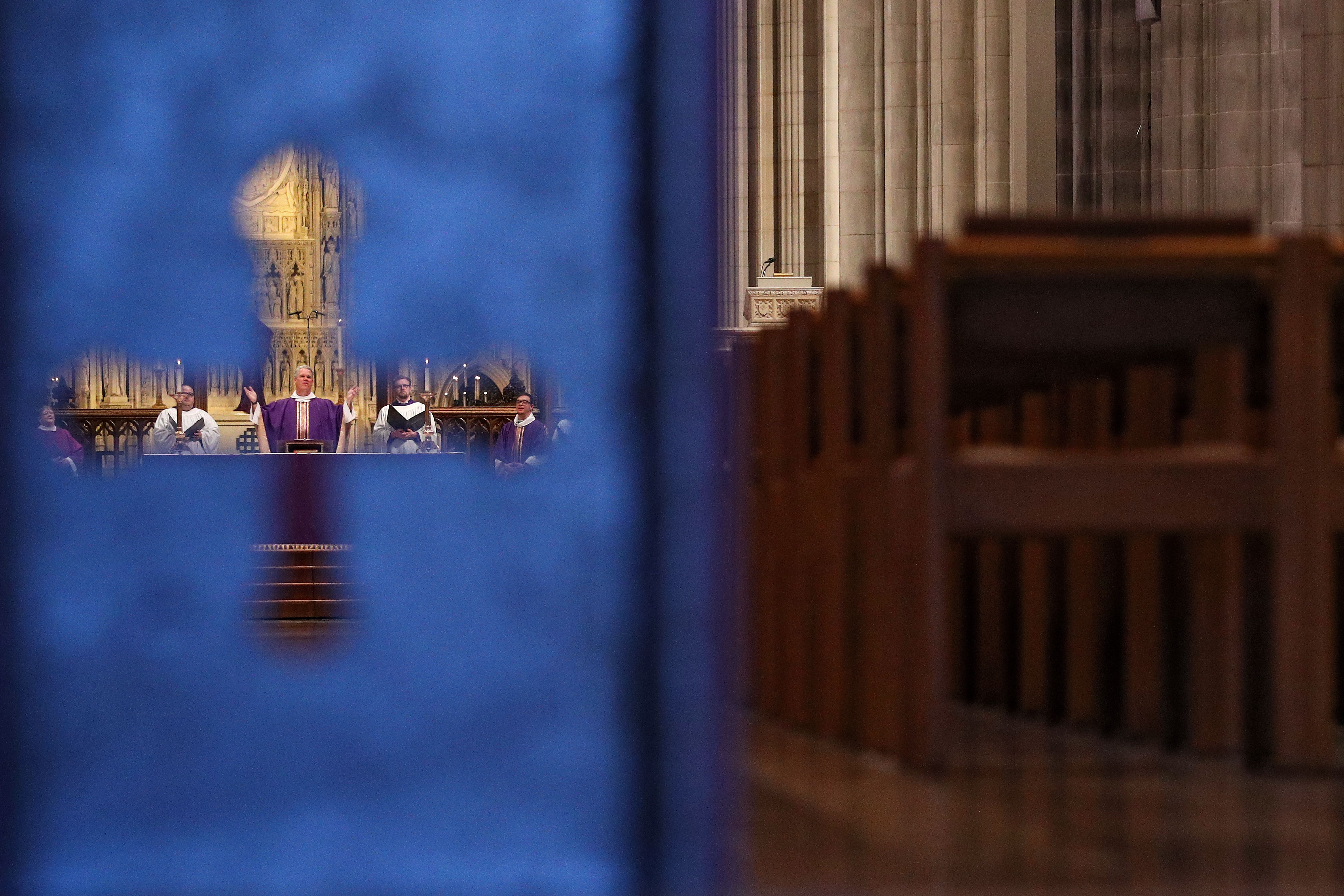 Below (two photos): At an empty Washington National Cathedral, the Very Rev. Dean Randy Hollerith holds a webcast Mass.
