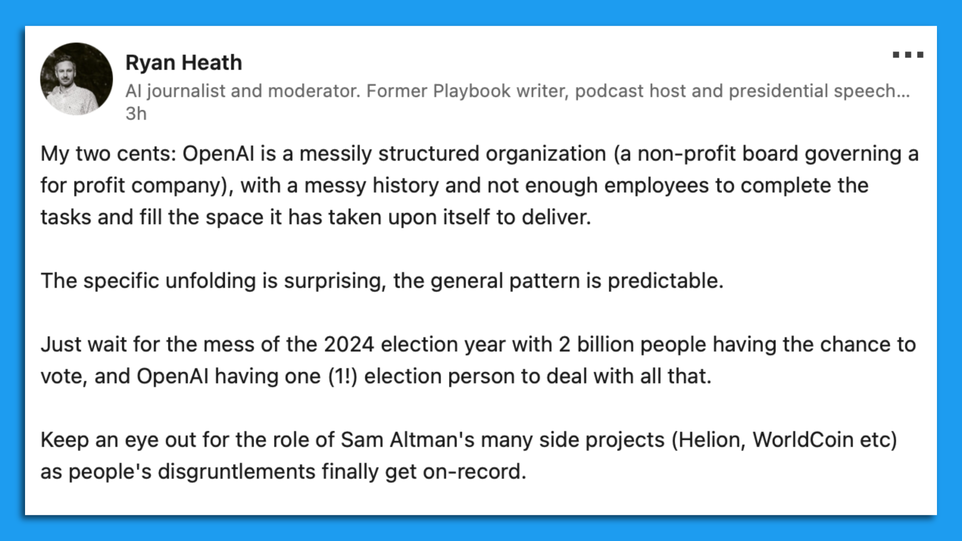 - It was a legit surprise, and the real board-Altman dynamics remain a mystery.