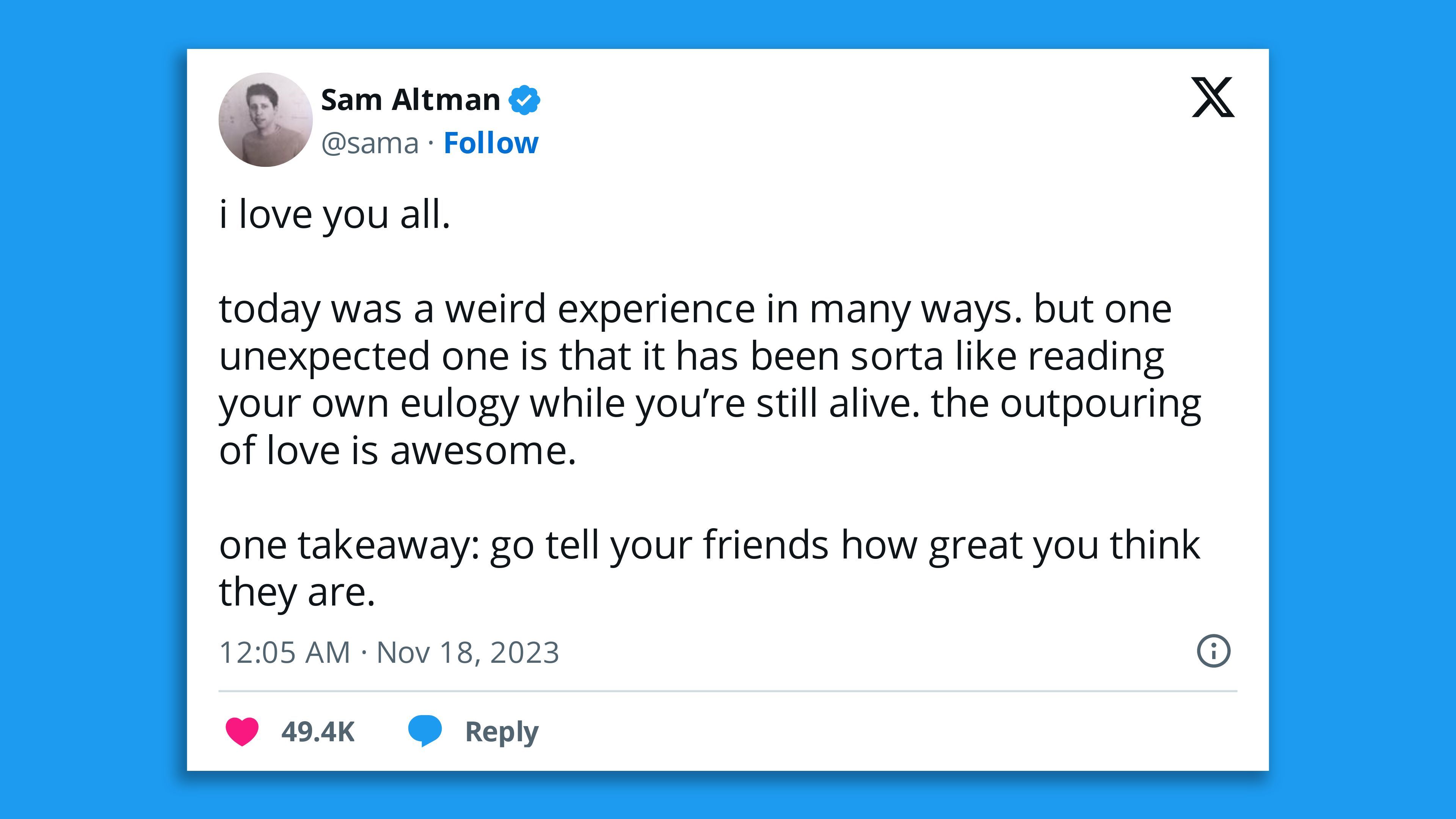 Sam Altman responded to his blockbuster ouster with a few posts on X yesterday.