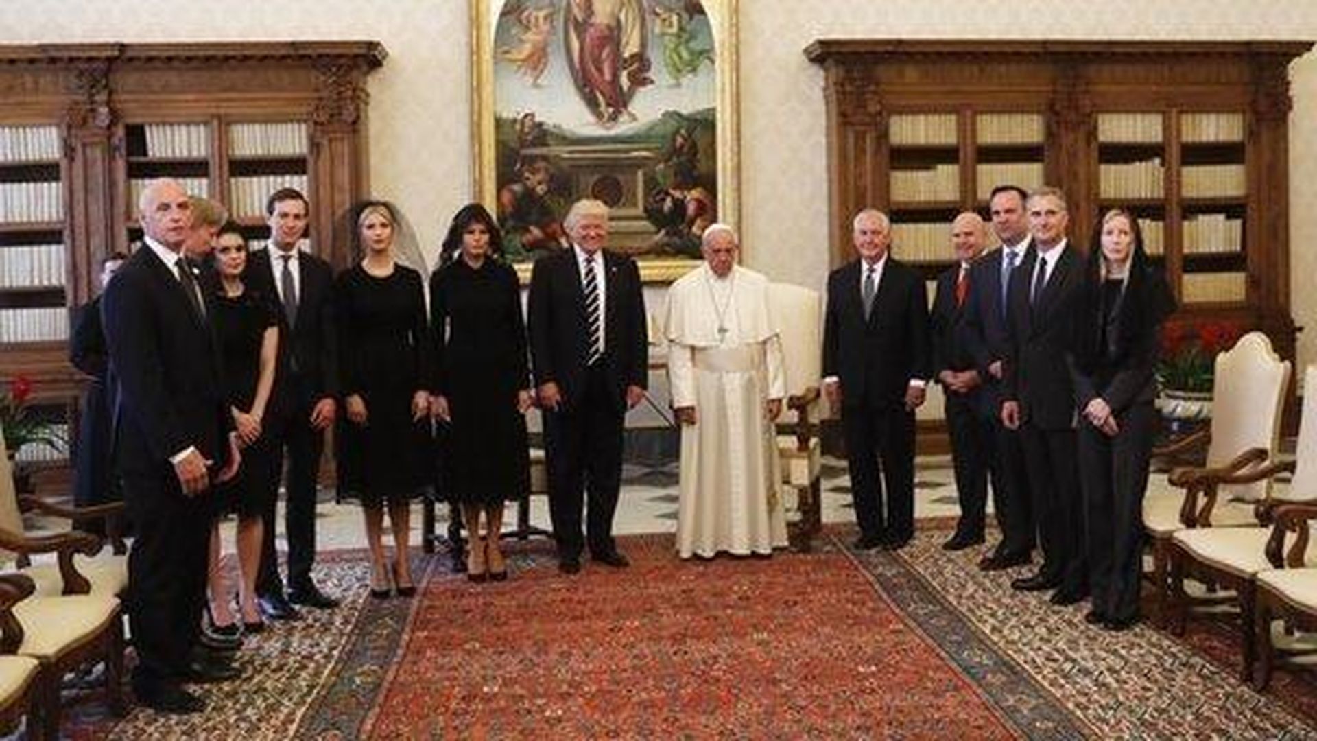 Pool report from President Trump at the Vatican today, by the Wall Street Journal's Carol Lee: "When pool entered the room, ... POTUS had already introduced Ivanka Trump, who ... wore a black lace dress and veil, and Jared Kushner. ... Other members of the delegation were still in the back of the room near pool.