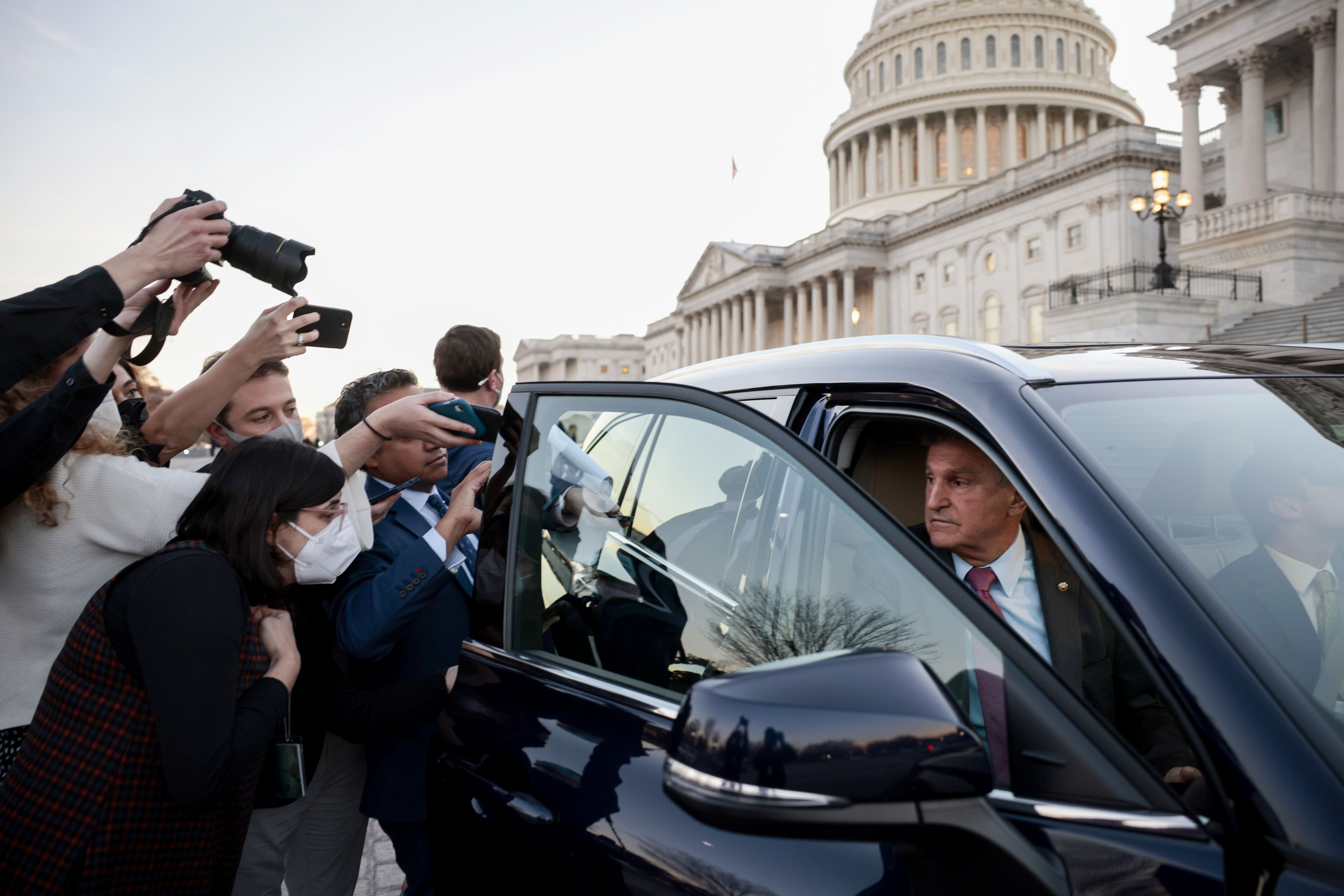 Sen. Joe Manchin (D-W.Va.), who holds the fate of President Biden's Build Back Better agenda in his hands, is followed to his car by reporters after voting yesterday.