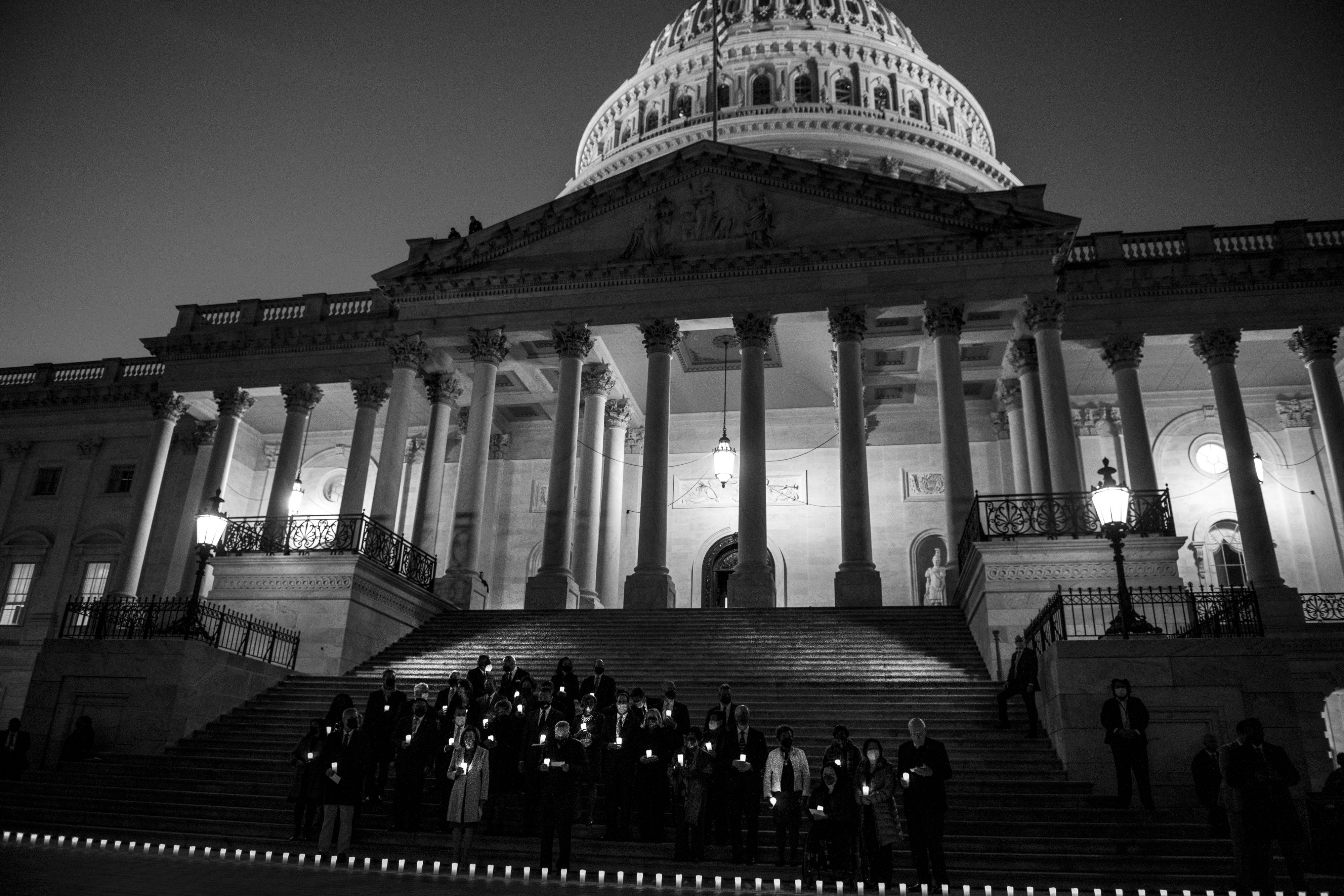Congressional leaders — both chambers, both parties — hold a moment of silence on the Capitol steps last evening, as America's COVID death toll passed 800,000. Video.