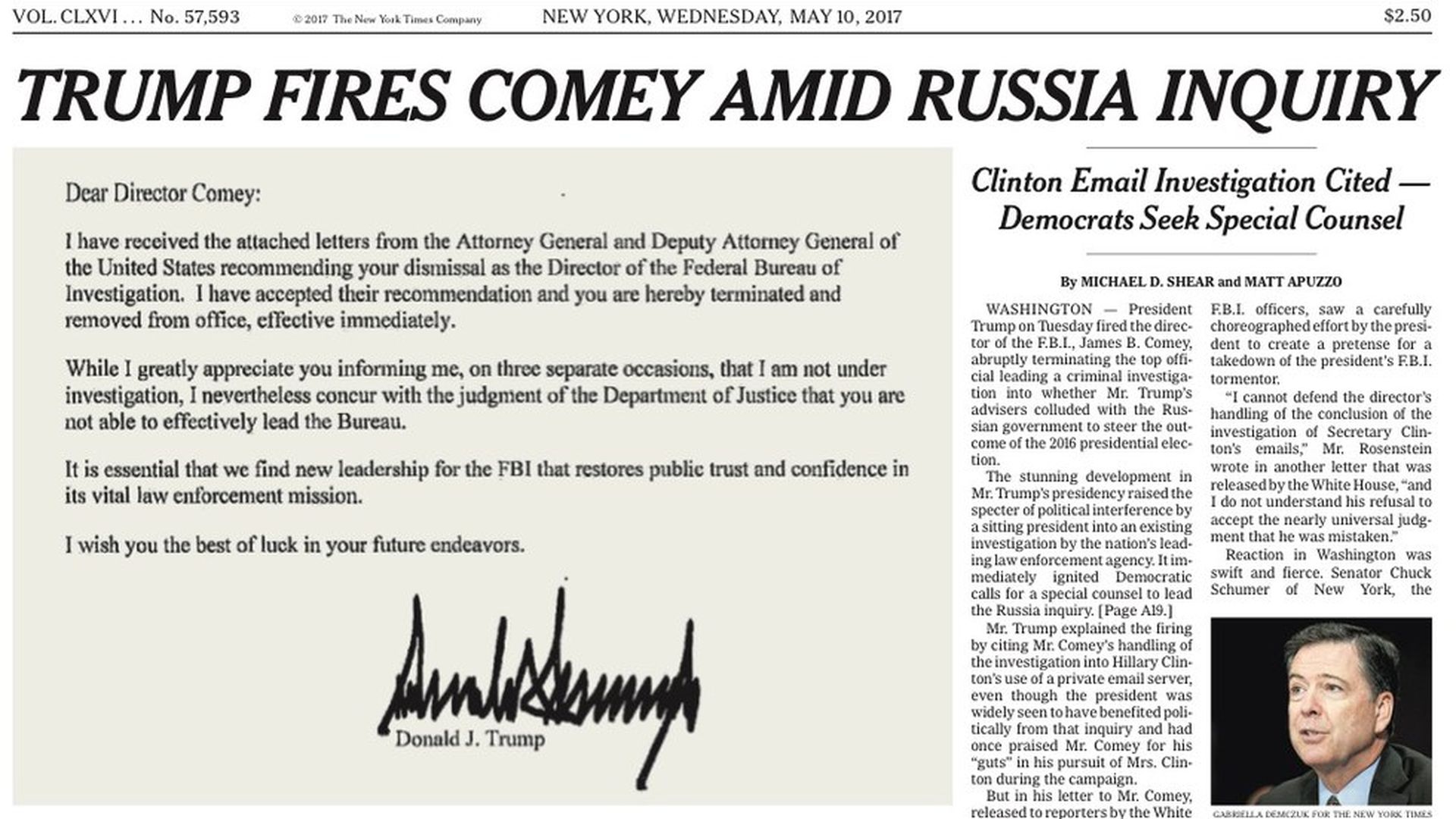- Washington Post: "Trump fires FBI director: Justice Dept. Cites Comey's Handling of Clinton Email Probe in Call for Dismissal."