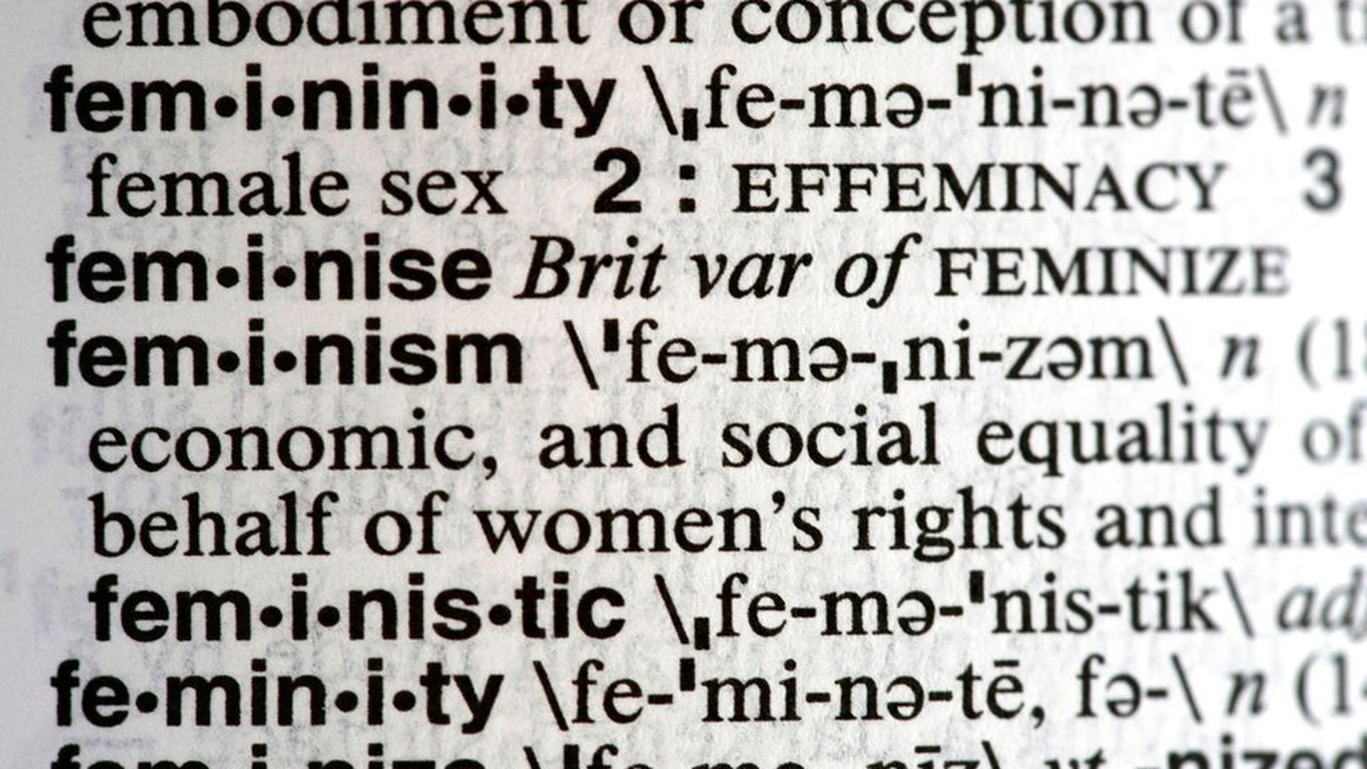 - "Today's definitions of feminism read: "the theory of the political, economic, and social equality of the sexes" and "organized activity on behalf of women's rights and interests."