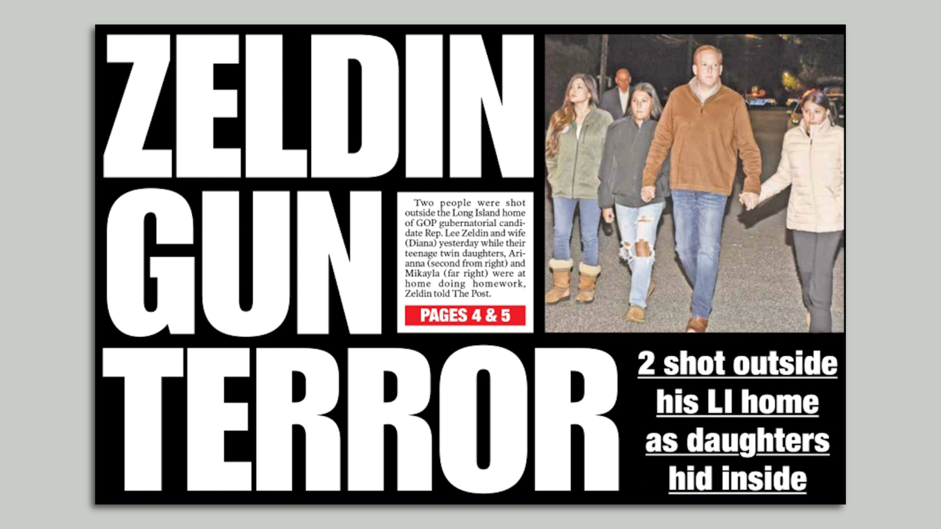 - "After my daughters heard the gunshots and the screaming, they ran upstairs, locked themselves in the bathroom and immediately called 911," said Zeldin, who's challenging New York Gov. Kathy Hochul (D) in next month's election.
