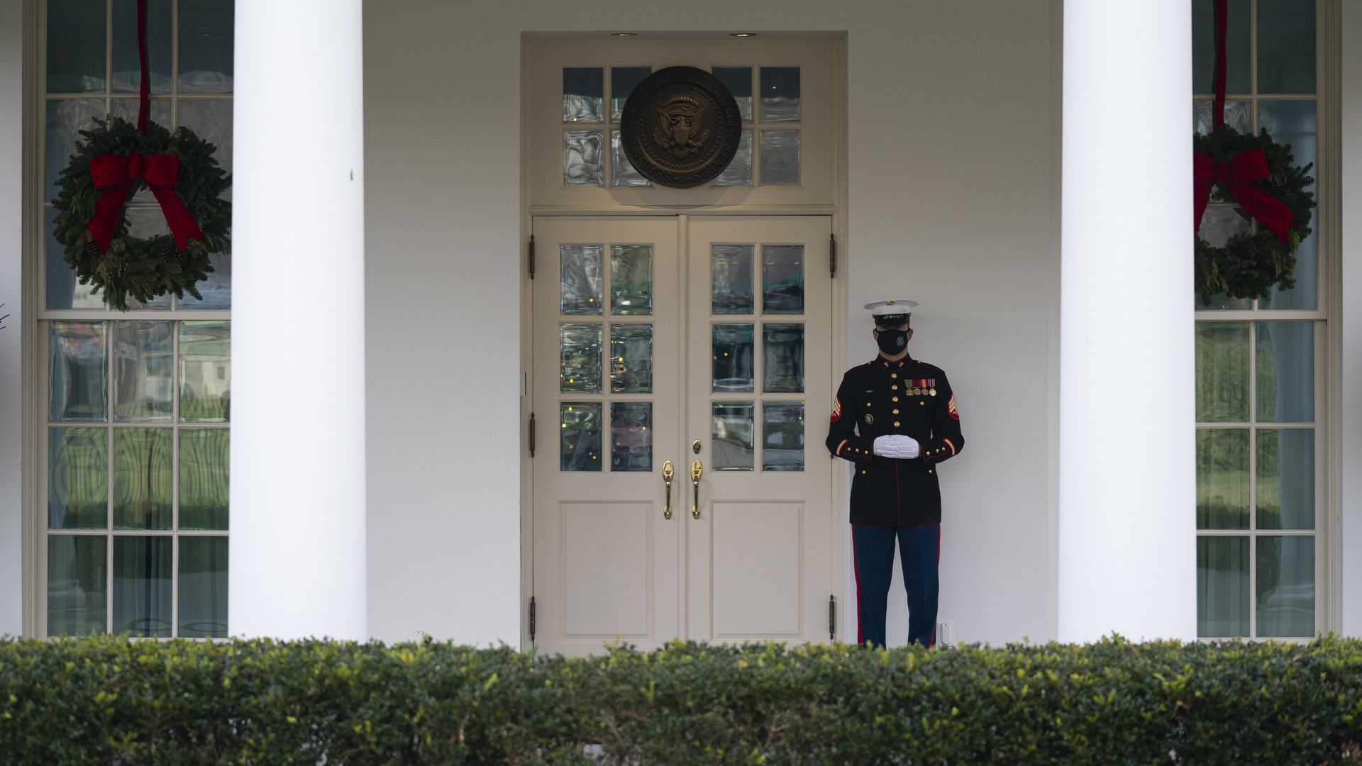 A Marine stands outside the West Wing of the White House yesterday, signifying the president is in the Oval Office. Photo: Evan Vucci/AP