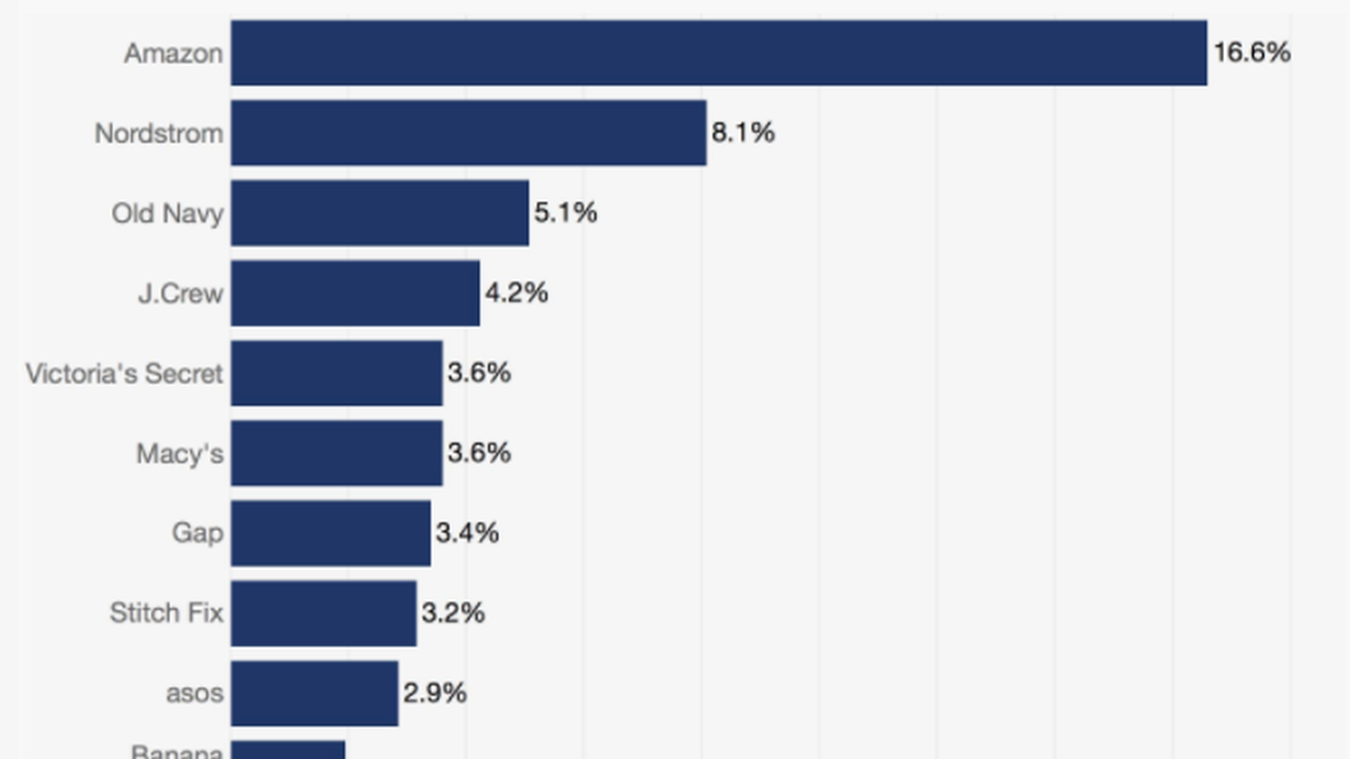 Amazon "accounted for nearly 17 percent of all online clothing sales to this demographic last year, more than doubling the market share of the No. 2 seller, Nordstrom. Old Navy, J. Crew and Victoria's Secret rounded out the Top 5."