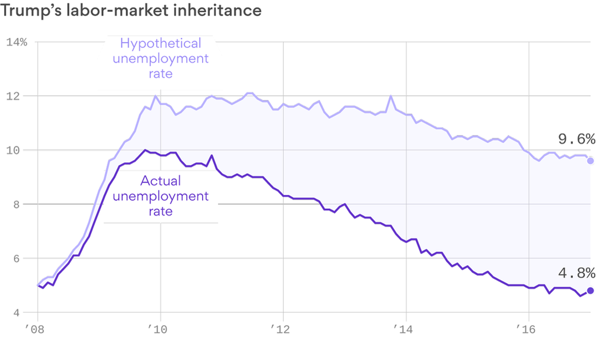 - What bears say: The president, and some economists, have argued that the falling unemployment rate was not the result of an improving economy, but folks giving up looking for work altogether. Indeed, if the labor force participation rate of 2008 were in effect today, the unemployment rate would be 9.6% rather than 4.8%.