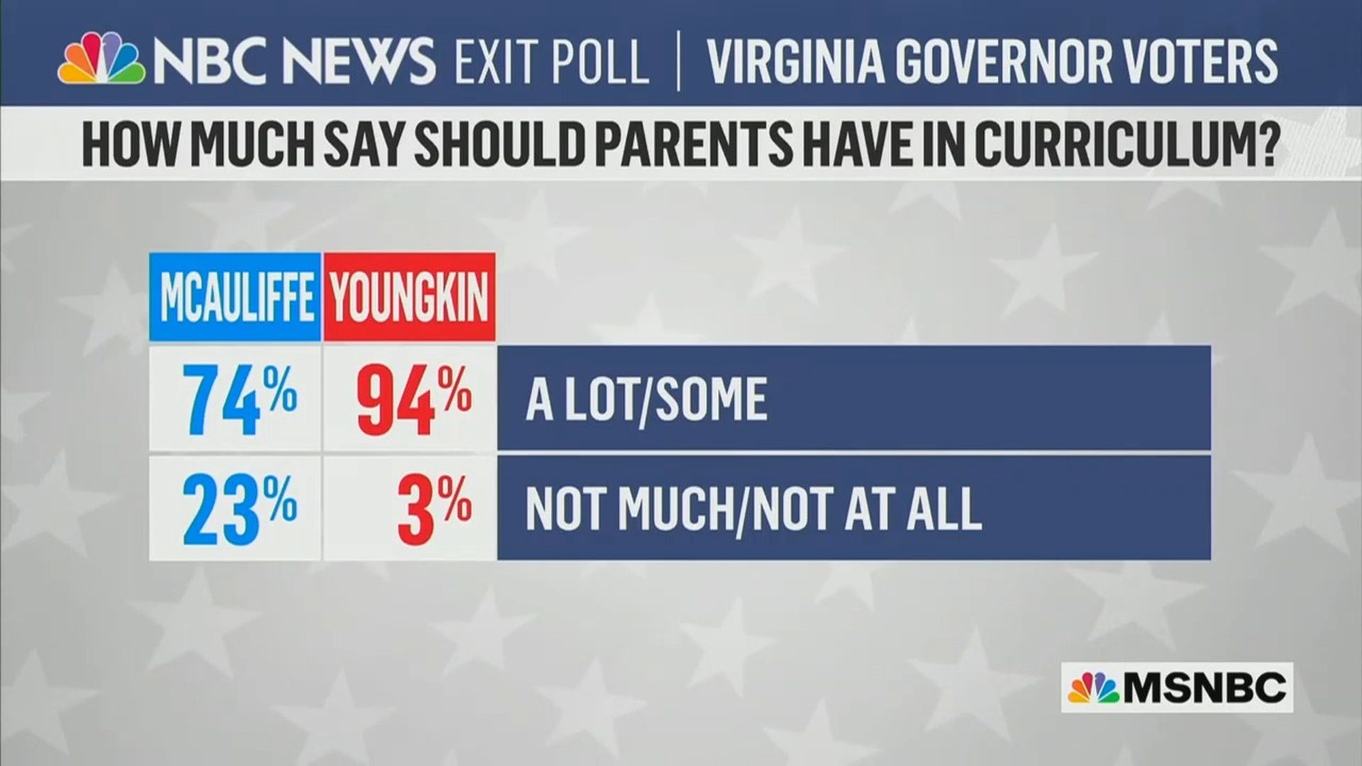 You could tell where the night was headed at 5:25 p.m. ET, when Josh Kraushaar tweeted how Virginia voters had answered the exit-poll question: How much say should parents have in their child's curriculum?