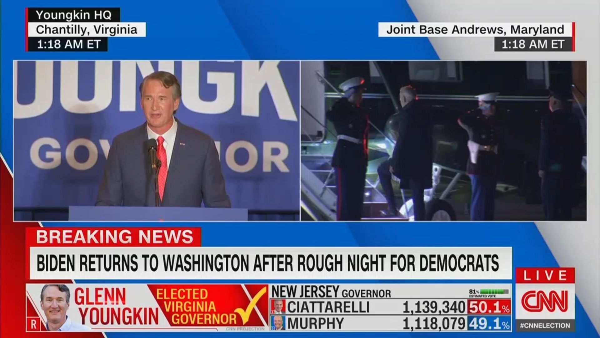 Split screen shows President Biden returning from Europe at the same moment Republican Glenn Youngkin was giving a victory speech in Virginia. Screenshot: CNN