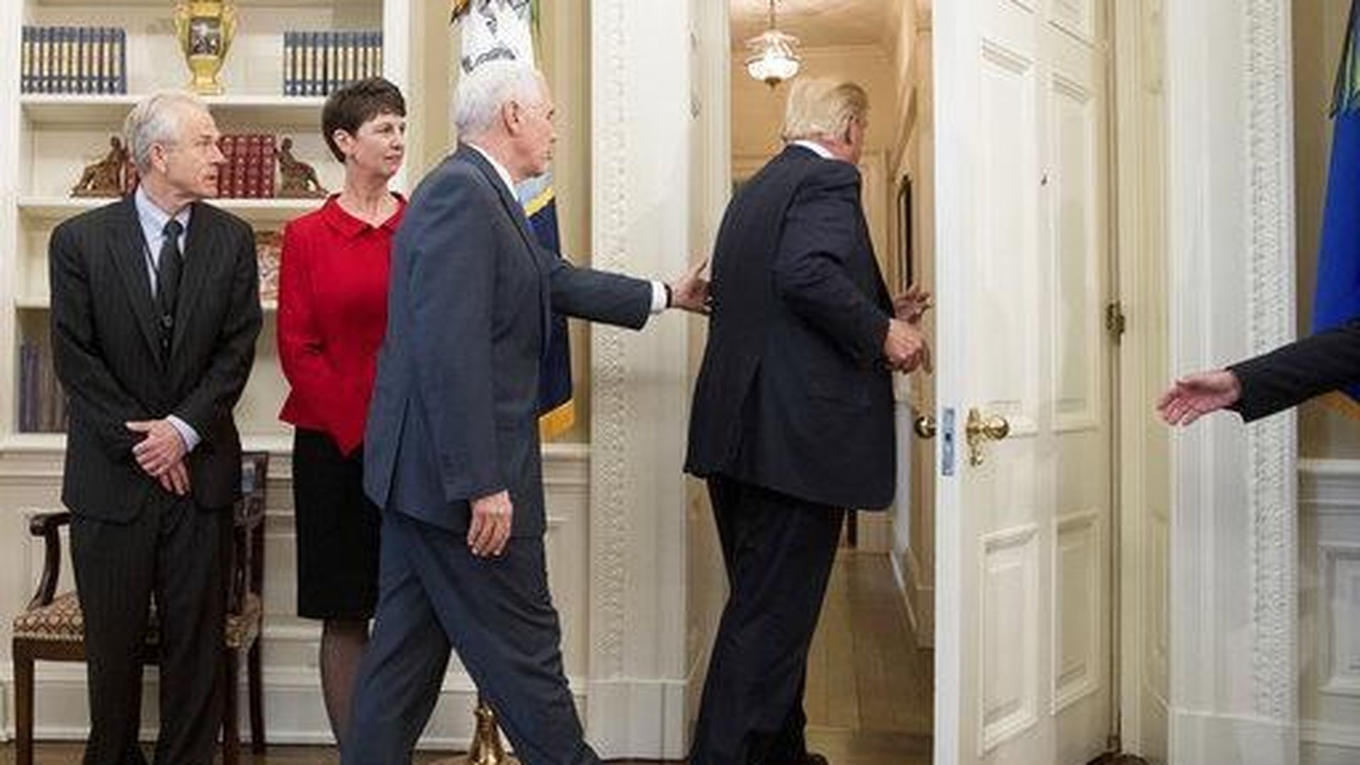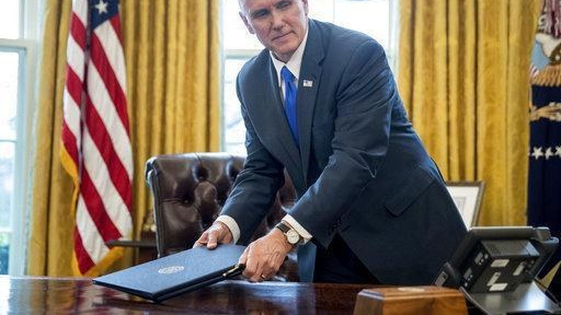 Vice President Pence retrieves a folder from the Oval Office desk after POTUS departed with a thumbs-up following remarks about signing two executive orders on trade — but apparently forgetting to sign them.