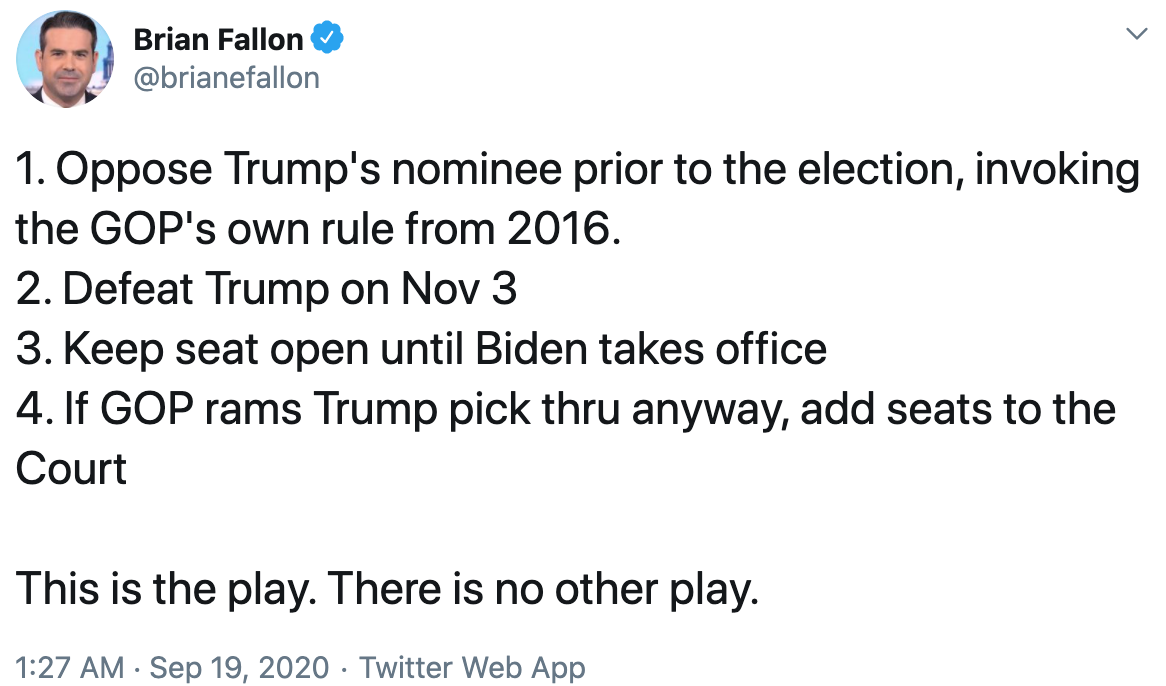 P.S. Brian Fallon — executive director of the progressive group Demand Justice, and a former top Schumer aide and Justice Department official — distilled the Democratic game plan: