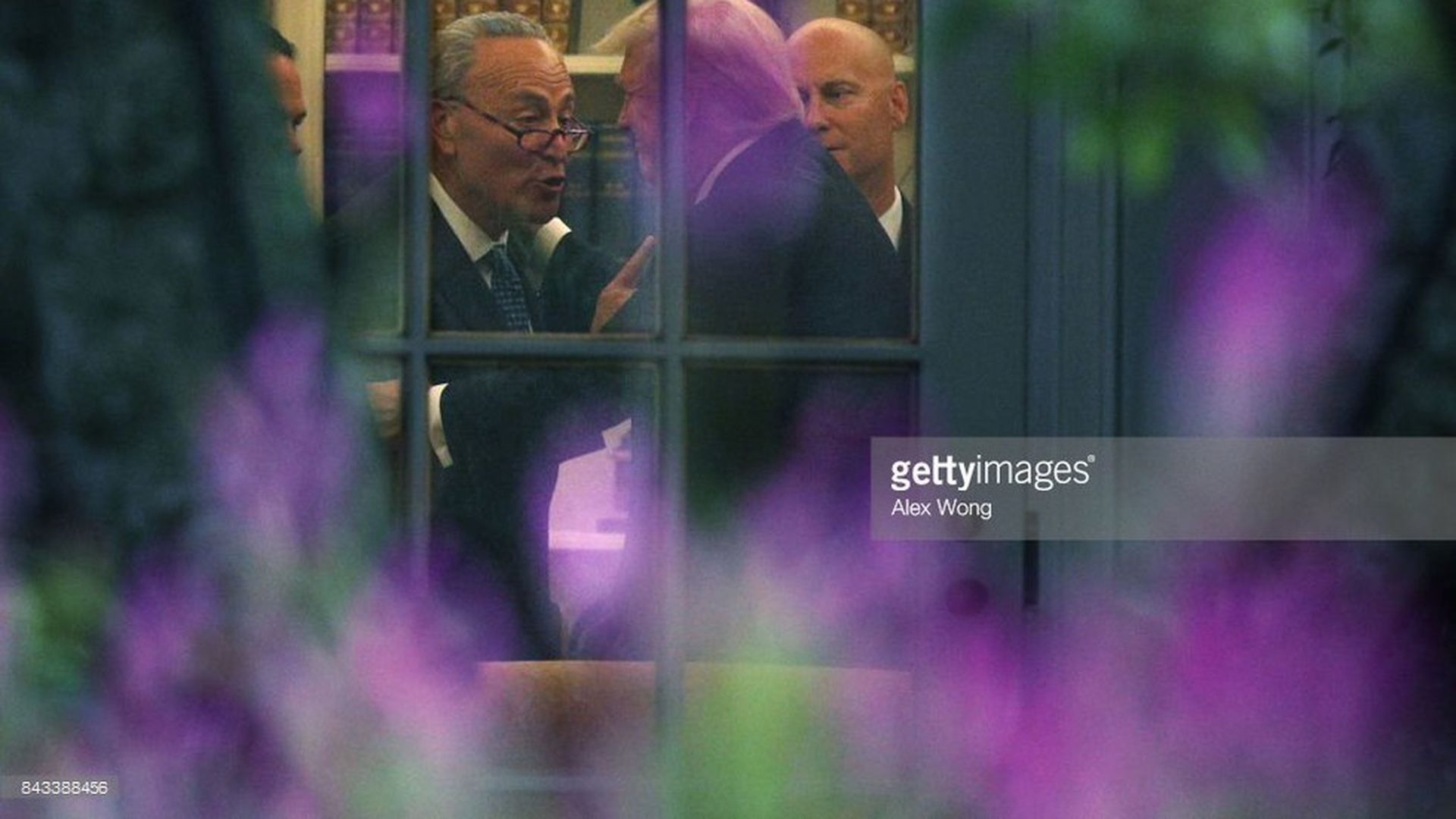 With LBJ-like closeness, Senate Democratic Leader Chuck Schumer makes an emphatic point to President Trump as Marc Short, Trump's director of legislative affairs, listens.