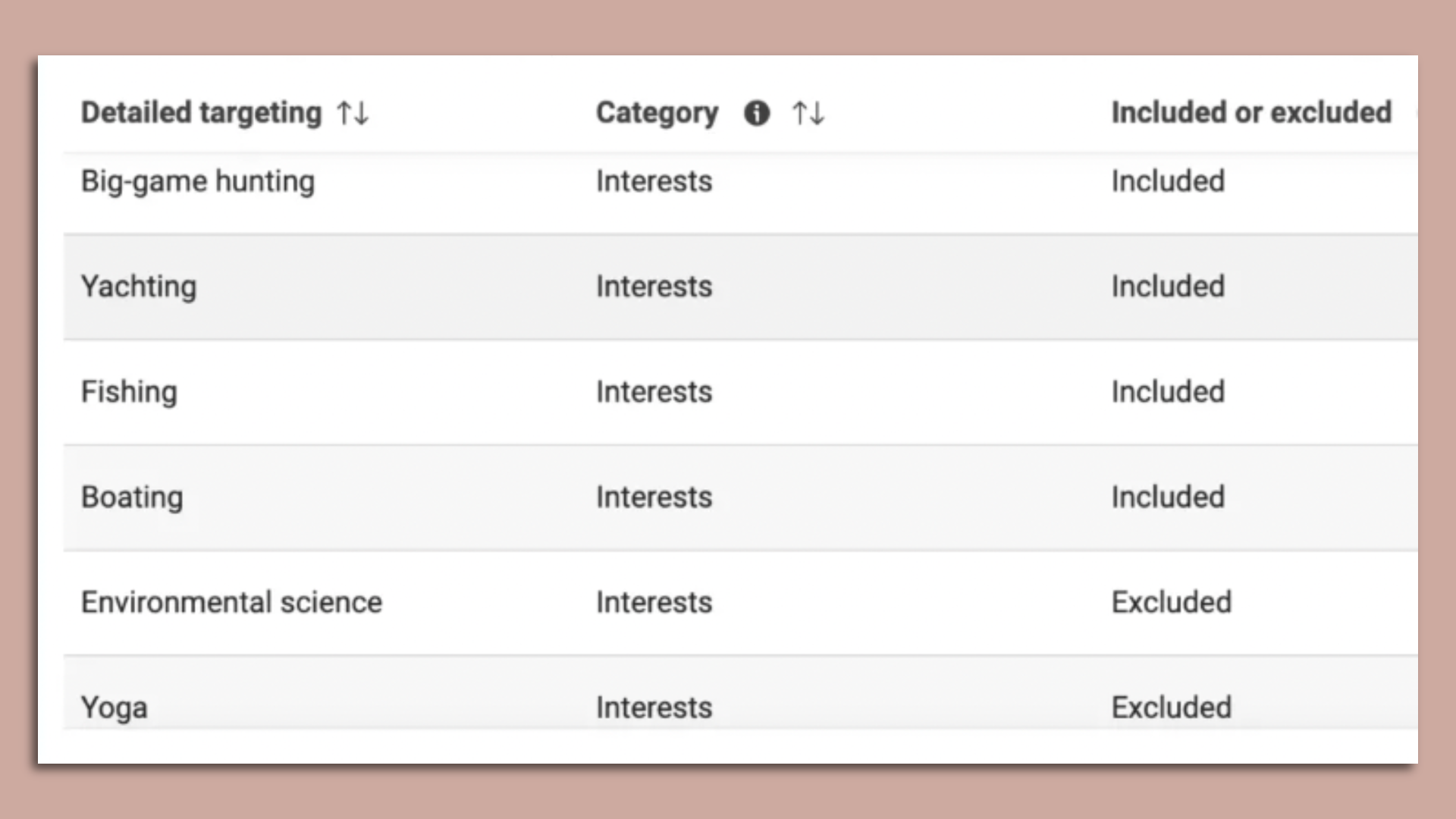 The ad targeting specifically excludes Facebook and Instagram users interested in yoga, environmental science, "education and libraries" and "social change."