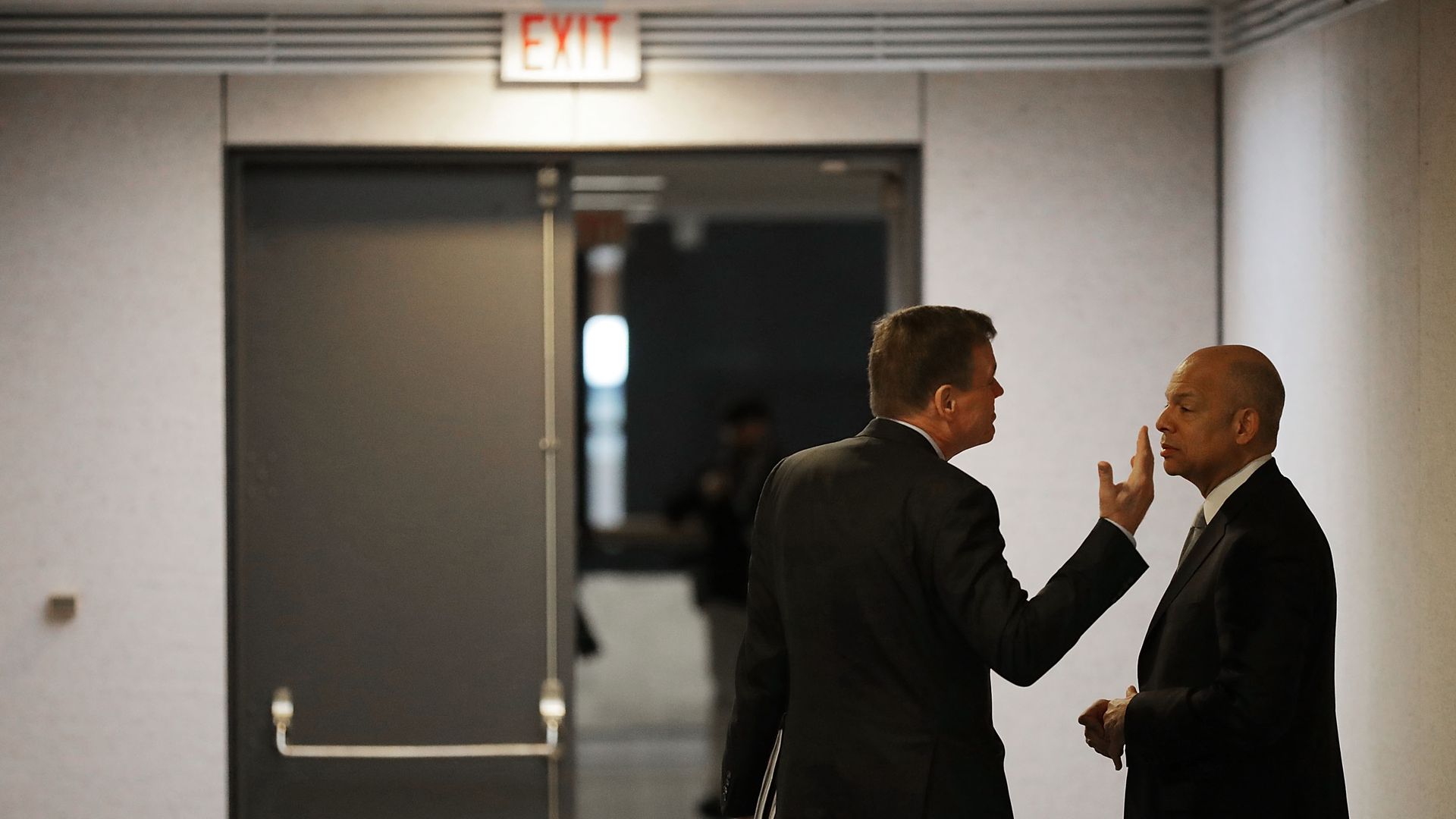 Senate Intelligence Committee holds hearing on election security: Vice Chairman Mark Warner (D-Va.) talks with former Homeland Security Secretary Jeh Johnson before his testimony in the Hart Senate Office Building. (Chip Somodevilla / Getty Images)