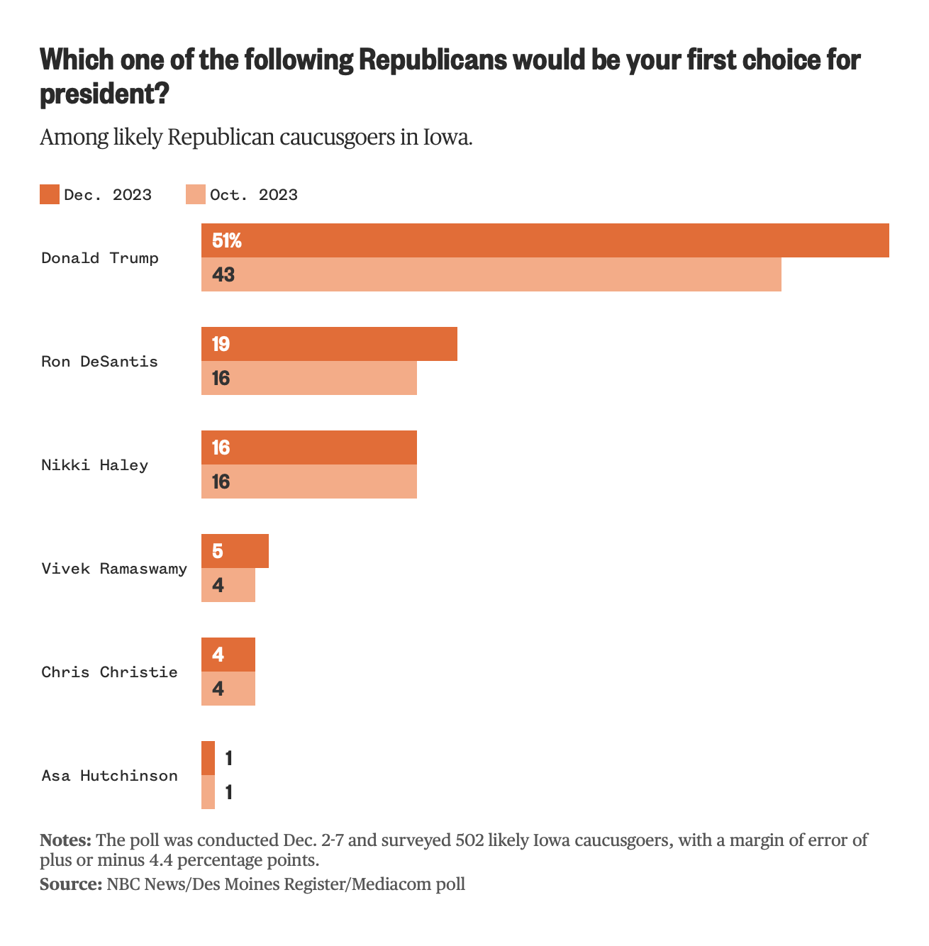 With 35 days until the Iowa caucuses, former President Trump has expanded his lead to 51% first-choice support among likely caucusgoers, according to an NBC News/Des Moines Register/Mediacom poll out this morning.