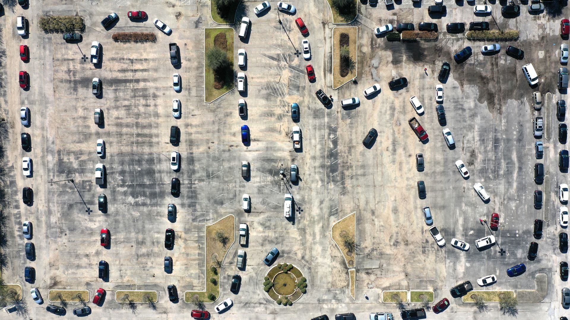 Drone's-eye view of cars lining up for a water distribution event at the Fountain Life Center in Houston yesterday. Photo: Justin Sullivan/Getty Images